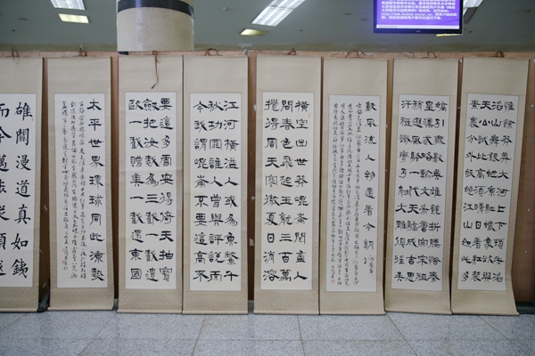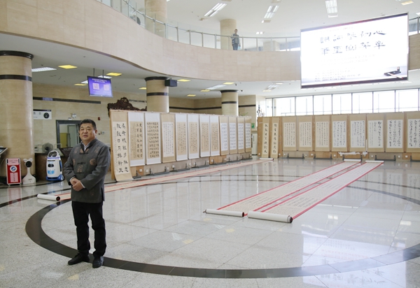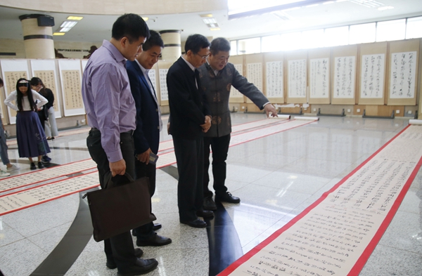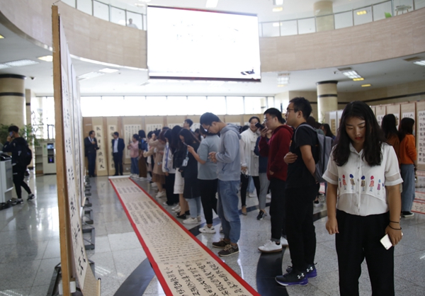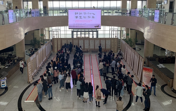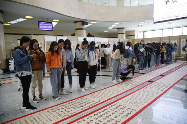該展覽共展出人文學院教師盧強用一年時間創(chuàng)作完成的,以真、行、草、隸等多種書體書寫的毛澤東詩詞書法作品50余幅,內(nèi)容豐富,形式多樣。其中,長130米、寬0.8米的書法長卷,以年代為序,精選了毛澤東1923年至1965年間各個時期的經(jīng)典詩詞42首,以工穩(wěn)的漢隸書寫,同時在每一首詩詞后以行書書寫個人的鑒賞學習體會,彰顯了毛澤東的心路歷程和人格魅力,深受在場師生的關(guān)注和好評。