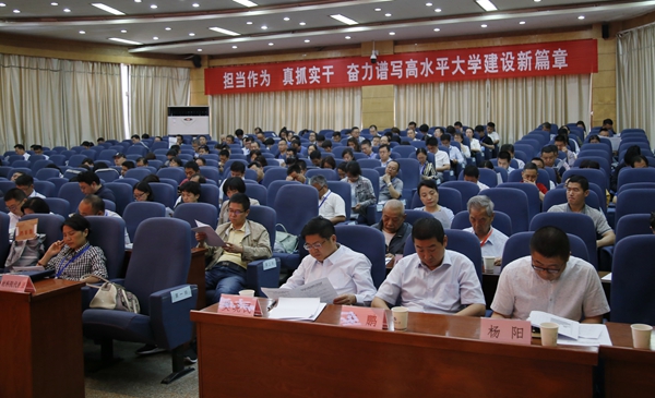 李校長(zhǎng)還對(duì)學(xué)校今后五年的工作作了安排部署。他指出,學(xué)校的總體目標(biāo)是:堅(jiān)持以習(xí)近平新時(shí)代中國特色社會(huì)主義思想為指導(dǎo),全面貫徹黨的教育方針,落實(shí)立德樹人根本任務(wù),聚焦內(nèi)涵、特色、協(xié)調(diào)、創(chuàng)新發(fā)展,凝心聚力,深化改革,勇于擔(dān)當(dāng),爭(zhēng)創(chuàng)一流,為建成特色鮮明的高水平教學(xué)研究型大學(xué)努力工作。一是全面加強(qiáng)黨的建設(shè),引領(lǐng)學(xué)校事業(yè)發(fā)展;二是緊盯爭(zhēng)創(chuàng)一流目標(biāo),加快學(xué)科建設(shè)步伐;三是深化人才工作改革,強(qiáng)化師資隊(duì)伍建設(shè);四是持續(xù)深化教學(xué)改革,提高教育教學(xué)質(zhì)量;五是加強(qiáng)科研管理創(chuàng)新,充分激發(fā)科研活力;六是提升學(xué)生工作實(shí)效,服務(wù)學(xué)生成長(zhǎng)成才;七是加強(qiáng)國內(nèi)外合作交流,提升開放辦學(xué)水平;八是完善現(xiàn)代大學(xué)制度,提升辦學(xué)治校能力;九是提高綜合保障能力,構(gòu)建和諧發(fā)展校園。