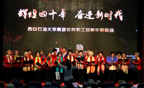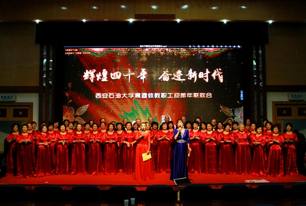 之后,老年大學(xué)的學(xué)員們與部分在職和離退休教職工為大家?guī)?lái)了精彩的文藝節(jié)目。聯(lián)歡會(huì)在開(kāi)場(chǎng)舞《春天的芭蕾》中拉開(kāi)了帷幕。老年大學(xué)女子合唱隊(duì)帶來(lái)的女聲小合唱《西安之夜》《浪花,海的頌歌》,合唱團(tuán)男生小合唱《一切獻(xiàn)給黨》《天路》,廣場(chǎng)舞分會(huì)帶來(lái)的舞蹈《藏舞串燒》,舞蹈協(xié)會(huì)帶來(lái)的戲曲古典舞《梨花頌》,葫蘆絲樂(lè)團(tuán)的聯(lián)奏《讓我聽(tīng)懂你的語(yǔ)言》《阿哥阿妹不分離》等節(jié)目,充分展示了老年大學(xué)的教學(xué)成果和老同志熱愛(ài)生活的精神面貌。崔巍老師表演的電吹管獨(dú)奏《梨花又開(kāi)放》《戰(zhàn)士為國(guó)守安詳》,高燕云、王宏順等老同志帶來(lái)的詩(shī)朗誦《祝酒歌》,展示了離退休教職工的多才多藝。老年大學(xué)合唱團(tuán)50多名團(tuán)員演唱的《牽手》,唱出了老同志們同甘共苦、相濡以沫的幸福,是對(duì)“執(zhí)子之手,與子偕老”的最好闡釋。大家在一片歡歌笑語(yǔ)聲中共同喜迎2019年的到來(lái)。