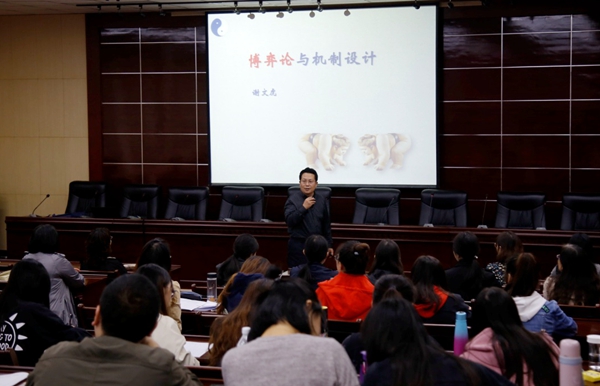 報告會由經(jīng)濟管理學(xué)院院長王君萍主持,全校100余名師生到場聆聽了報告。謝文虎教授從“和尚分粥博弈”“礦難博弈”“獵人博弈”三個經(jīng)典的博弈案例入手,向師生闡述了博弈論的基本概念,詳細(xì)講解了“納什均衡”“帕累托效率”“帕累托最優(yōu)”等經(jīng)濟學(xué)概念,并從“通俗易懂平話博弈論”“深入淺出解讀博弈論”“致力實踐運用博弈論”三個方面,全面介紹了博弈論與機制設(shè)計理論的內(nèi)在邏輯關(guān)系。謝教授結(jié)合多年豐富的工作經(jīng)驗和淵博的知識,對“機制設(shè)計與管理實踐”提出了獨到的見解,語言平實風(fēng)趣,案例生動豐富,受到了師生們的廣泛好評。
