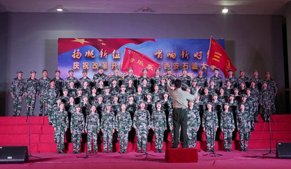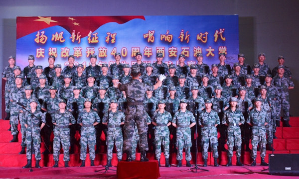 9月17日晚,我?!皳P帆新征程,唱響新時代——慶祝改革開放40周年西安石油大學2018級新生軍訓歌詠比賽”在鄠邑校區(qū)西田徑場舉行。軍訓領導小組組長、校黨委副書記張木,軍訓旅司令部參謀長劉廣出席活動。學生工作處、保衛(wèi)處、校團委、教務處、鄠邑校區(qū)管理辦公室等相關部門負責人擔任評委,各院(系)軍訓工作負責人及2018級全體新生一同觀看了比賽。