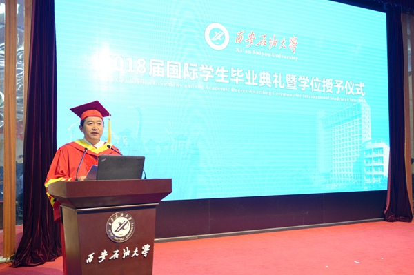 6月27日下午,我校2018屆國際學(xué)生畢業(yè)典禮暨學(xué)位授予儀式在雁塔校區(qū)學(xué)術(shù)報(bào)告廳舉行。校長李天太,特邀嘉賓、原校長屈展出席。副校長陳軍斌主持。哈薩克斯坦國際一體化基金會西安代表處負(fù)責(zé)人,我校相關(guān)部門、學(xué)院負(fù)責(zé)人,國際學(xué)生導(dǎo)師代表、國際學(xué)生教學(xué)與管理人員,全體畢業(yè)國際學(xué)生、家長代表、在校學(xué)歷留學(xué)生參加了儀式。