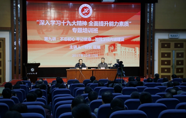 歷經(jīng)20余天的學(xué)習(xí)培訓(xùn),我?!吧钊雽W(xué)習(xí)黨的十九大精神,全面提升能力素質(zhì)”處級(jí)干部專題培訓(xùn)班至此已經(jīng)圓滿完成了各項(xiàng)培訓(xùn)任務(wù)。培訓(xùn)期間,學(xué)校黨委高度重視,先后邀請(qǐng)領(lǐng)導(dǎo)干部、專家學(xué)者圍繞黨的十九大精神學(xué)習(xí)、高等教育改革發(fā)展、管理能力提升等方面開展了十場(chǎng)專題輔導(dǎo)報(bào)告,全校處級(jí)干部積極參加培訓(xùn)學(xué)習(xí),深入學(xué)習(xí)領(lǐng)會(huì)黨的十九大精神和習(xí)近平新時(shí)代中國(guó)特色社會(huì)主義思想,切實(shí)增強(qiáng)“四個(gè)意識(shí)”、堅(jiān)定“四個(gè)自信”,深刻把握高等教育發(fā)展的新形勢(shì)和加強(qiáng)學(xué)科建設(shè)、人才培養(yǎng)的新思路新方法,不斷提升管理能力和綜合素質(zhì),為推動(dòng)黨的十九大精神在我校落地生根,推進(jìn)學(xué)校創(chuàng)建一流學(xué)科一流專業(yè),實(shí)現(xiàn)追趕超越目標(biāo)打下了堅(jiān)實(shí)的基礎(chǔ)。