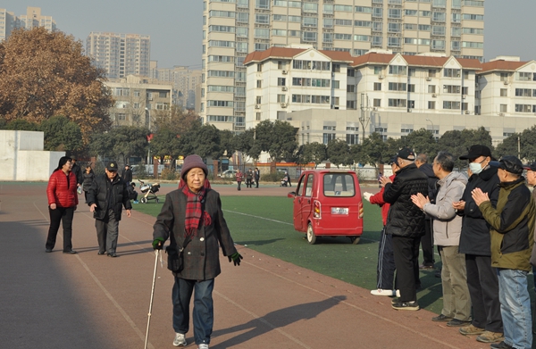 離退休黨總支書記楊西坤宣讀了比賽規(guī)則。80周歲及以上年齡段的老同志繞田徑場一周,限時10分鐘以內(nèi)完成。70至79周歲的老同志男、女分組,繞田徑場兩周,在15分鐘以內(nèi)完成。70周歲以下的老同志男、女分組,繞田徑場三周,在20分鐘內(nèi)完成。盡管很多老同志年事已高,腿腳不是很靈活,但是大家精神抖擻,三三兩兩結(jié)伴而行,紛紛完成了行走任務(wù)。