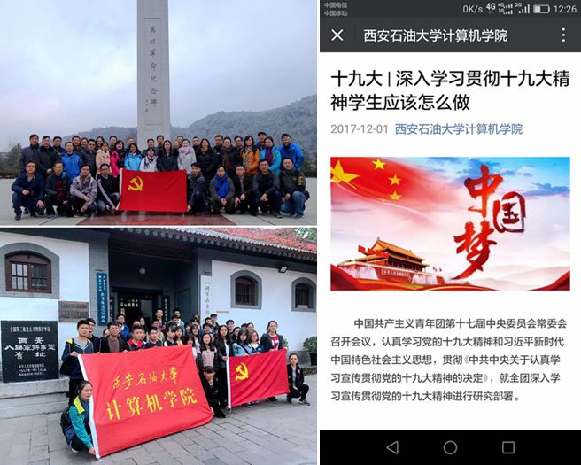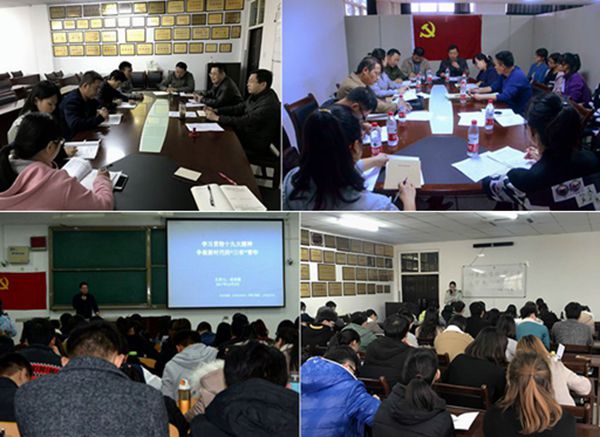 10月21日,學(xué)院師生黨員46人赴八路軍西安辦事處紀(jì)念館參觀,接受革命傳統(tǒng)教育;10月28日,學(xué)院黨委下發(fā)微學(xué)習(xí)材料《切實(shí)學(xué)懂弄通做實(shí)黨的十九大精神·努力在新時(shí)代開啟新征程續(xù)寫新篇章》;11月8日,學(xué)院黨委下發(fā)微學(xué)習(xí)材料《黨的十九大黨章修正案的新時(shí)代意蘊(yùn)》;11月19日,學(xué)院五十余名教工黨員前往陜甘邊革命根據(jù)地的中心——馬欄革命舊址參觀學(xué)習(xí),學(xué)習(xí)革命精神,緬懷革命先烈;11月22日,學(xué)院邀請校黨委委員、宣傳部部長李國武為全院教職員工作題為《信息時(shí)代高校意識形態(tài)工作》的專題講座,進(jìn)一步提升教職員工的文化自信;12月1日,學(xué)院微信公眾號推送《黨的十九大│深入學(xué)習(xí)貫徹黨的十九大精神學(xué)生應(yīng)該怎么做》,文章對新時(shí)代青年提出五點(diǎn)要求。