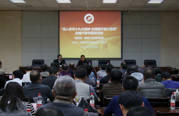 11月28日下午,我校“深入學習黨的十九大精神,全面提升能力素質”處級干部專題培訓班第四講在雁塔校區(qū)會議中心第三會議室舉辦。省教育廳科技處處長甘世平應邀來校作報告,副校長李天太主持報告會,全校處級干部參加報告會。