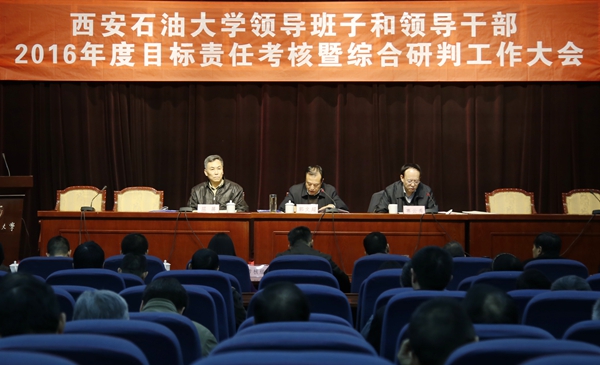 3月24日上午,省委組織部、省委高教工委在我校學(xué)術(shù)報(bào)告廳召開(kāi)了西安石油大學(xué)領(lǐng)導(dǎo)班子和領(lǐng)導(dǎo)干部2016年度目標(biāo)責(zé)任考核暨綜合研判工作大會(huì)。省屬高校領(lǐng)導(dǎo)班子和領(lǐng)導(dǎo)干部目標(biāo)責(zé)任考核暨綜合研判第二工作小組組長(zhǎng)、陜西省干部教育辦公室副主任郭文超出席會(huì)議并講話。校黨委書(shū)記賽云秀主持大會(huì)。省紀(jì)委駐教育廳紀(jì)檢組副組長(zhǎng)易紅彬、省教育廳離退處副處長(zhǎng)王亞麗、省委組織部宣教干部處主任科員李芃、省委高教工委組織部干部馮政清、西安理工大學(xué)人事處干部程瑤等考核組成員,我校校領(lǐng)導(dǎo)、校黨委委員、紀(jì)委委員、學(xué)術(shù)委員會(huì)委員、工會(huì)委員,正高職稱專業(yè)技術(shù)人員,正處級(jí)以上領(lǐng)導(dǎo)干部,市級(jí)以上人大代表、政協(xié)委員,民主黨派主要負(fù)責(zé)人,近三年退休的校級(jí)領(lǐng)導(dǎo)干部參加大會(huì)。