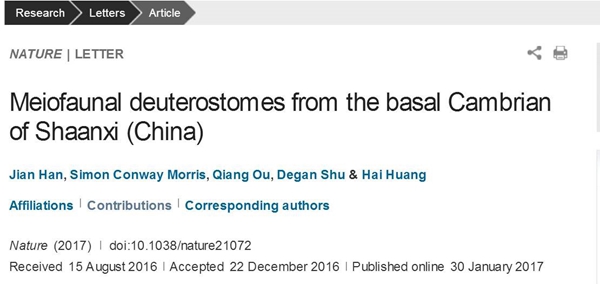 倫敦當(dāng)?shù)貢r(shí)間1月30日16時(shí)(北京時(shí)間1月31日0時(shí))在線提前出版的英國(guó)《Nature》(自然)雜志,以封面亮點(diǎn)文章的形式,發(fā)表了我校石油工程學(xué)院黃海副教授與西北大學(xué)早期生命研究團(tuán)隊(duì)、劍橋大學(xué)、中國(guó)地質(zhì)大學(xué)(北京)等單位合作研究的重要成果——《陜西寒武紀(jì)最早期的微型后口動(dòng)物》。