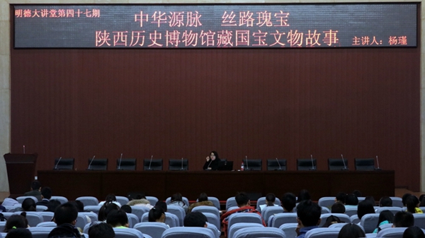 12月14日晚,由合作發(fā)展處、校團(tuán)委共同主辦的第47期明德大講堂之《中華源脈 絲路瑰寶——陜西歷史博物館藏國(guó)寶文物故事》在新校區(qū)圖書(shū)館弘石學(xué)術(shù)報(bào)告廳舉辦。陜西歷史博物館科研管理處處長(zhǎng)、中共陜西省委宣傳部理論講師團(tuán)特聘專家楊瑾老師擔(dān)任主講,新校區(qū)近四百余名學(xué)生聽(tīng)取了講座。
