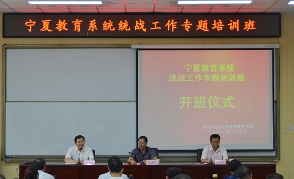 9月5日上午,由寧夏回族自治區(qū)教育工委主辦、我校繼續(xù)教育學(xué)院承辦的“寧夏教育系統(tǒng)統(tǒng)戰(zhàn)工作專(zhuān)題培訓(xùn)班”在南區(qū)培訓(xùn)中心舉行了開(kāi)班儀式。寧夏教育工委副書(shū)記趙建峰、寧夏教育工委黨建工作部部長(zhǎng)孫金忠,我校副校長(zhǎng)李天太以及來(lái)自寧夏教育系統(tǒng)的50余名統(tǒng)戰(zhàn)干部參加了開(kāi)班儀式。