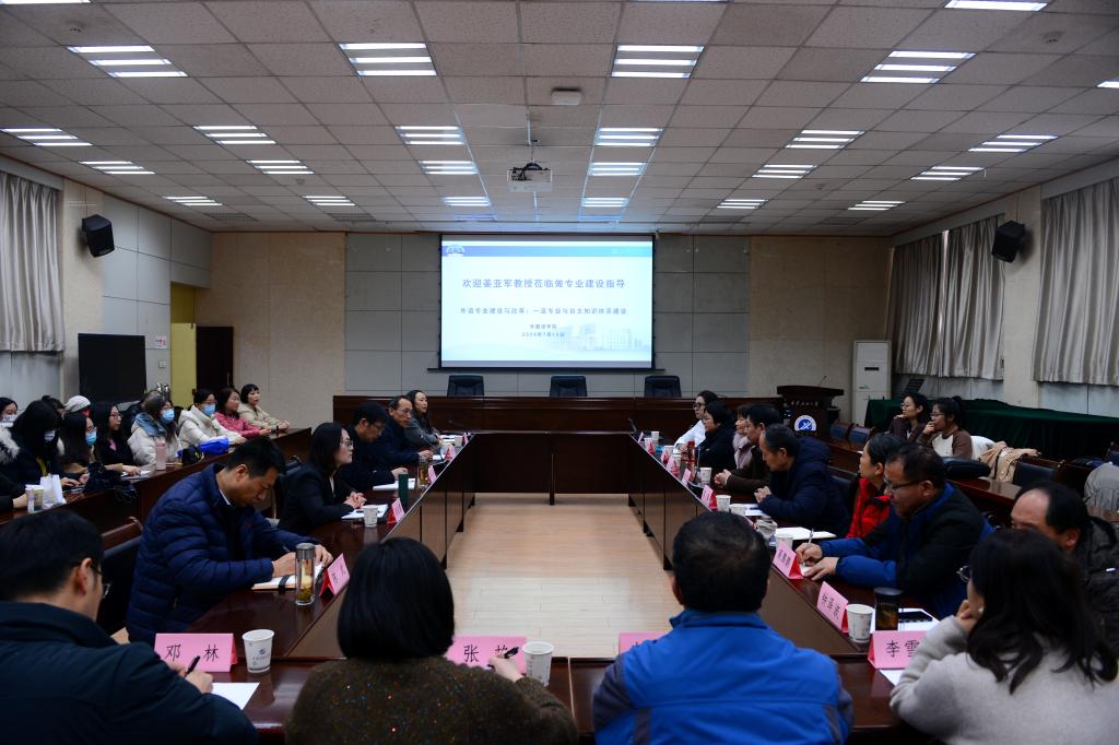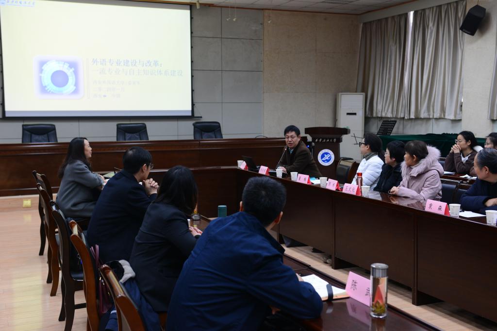 為迎接新一輪本科教育教學審核評估,做好迎評促建,扎實推進外語專業(yè)建設及英語國家級一流本科專業(yè)建設點驗收準備工作,我校邀請西安外國語大學副校長姜亞軍教授來校指導外語專業(yè)建設。1月16日下午,在雁塔校區(qū)會議中心第三會議室開展了題為“外語專業(yè)建設與改革:一流專業(yè)與自主知識體系建設”的報告會及交流座談。我校副校長蘇文甫、張君濤出席會議。外國語學院班子成員、各專業(yè)帶頭人及負責人、系部主任及所有任課教師參加了會議,會議由外國語學院副院長劉輝主持。