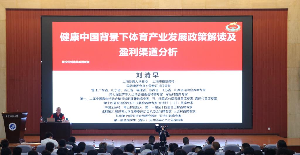 當(dāng)晚,劉清早教授作客“明德大講堂”,在鄠邑校區(qū)圖書館弘石學(xué)術(shù)報告廳為師生帶來了題為《健康中國背景下體育產(chǎn)業(yè)發(fā)展政策解讀及盈利渠道分析》的專題講座。本次講座由體育學(xué)院和校團(tuán)委主辦,體育學(xué)院黨總支書記茍毅飛,保衛(wèi)(部)處、武裝部副部(處)長袁坤等參加報告會,學(xué)院專業(yè)教師代表,教學(xué)辦、學(xué)工辦工作人員及全校400余名學(xué)生共同聆聽了講座。報告會由體育學(xué)院院長李壽邦主持。