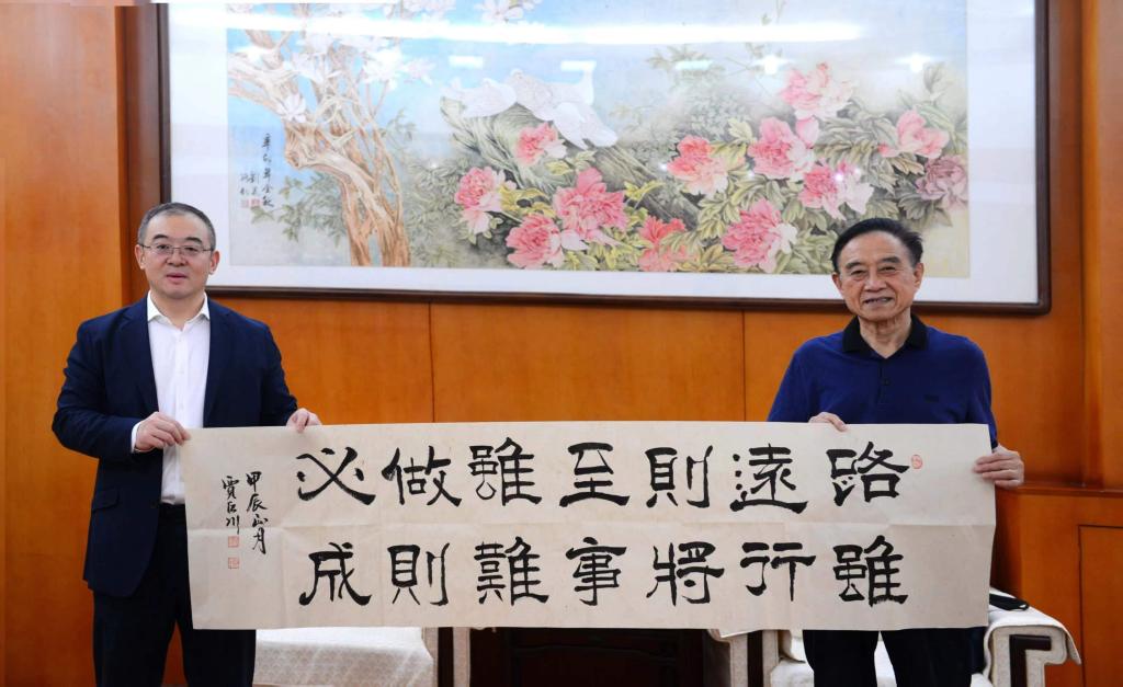 會(huì)前,校黨委書(shū)記常江、副校長(zhǎng)程永清與賈巨川在雁塔校區(qū)會(huì)議中心座談。常江為賈巨川教授頒發(fā)紀(jì)念品。同時(shí),賈巨川教授也向?qū)W校贈(zèng)送親筆字卷,以此表達(dá)對(duì)西安石油大學(xué)的至誠(chéng)祝愿。