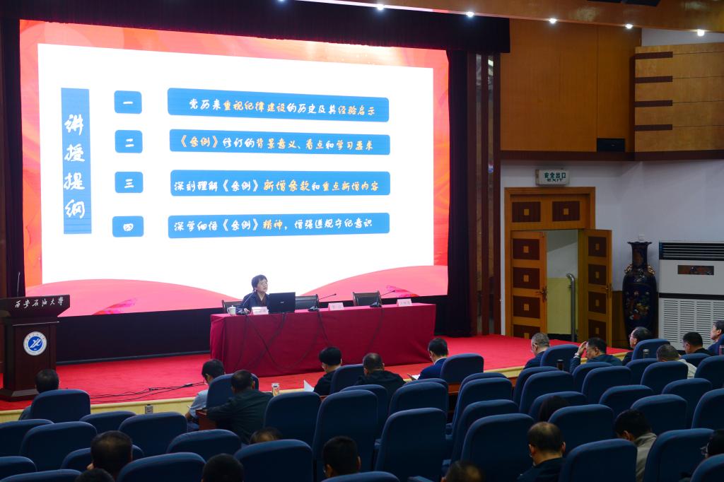 會上,李曉燕教授以“開展黨紀學習教育 強化遵規(guī)守紀意識”為題,圍繞學習新修訂的《條例》,從介紹修訂過程,闡述修訂意義,聚焦《條例》總則、政治紀律、組織紀律、廉潔紀律、群眾紀律、工作紀律、生活紀律等,解讀《條例》修訂內容,提出貫徹落實新《條例》有效舉措等方面,作了專題輔導報告。報告重點突出,觀點鮮明,資料詳實,分析深刻,為進一步學習貫徹《條例》理清了思路、啟迪了思考。