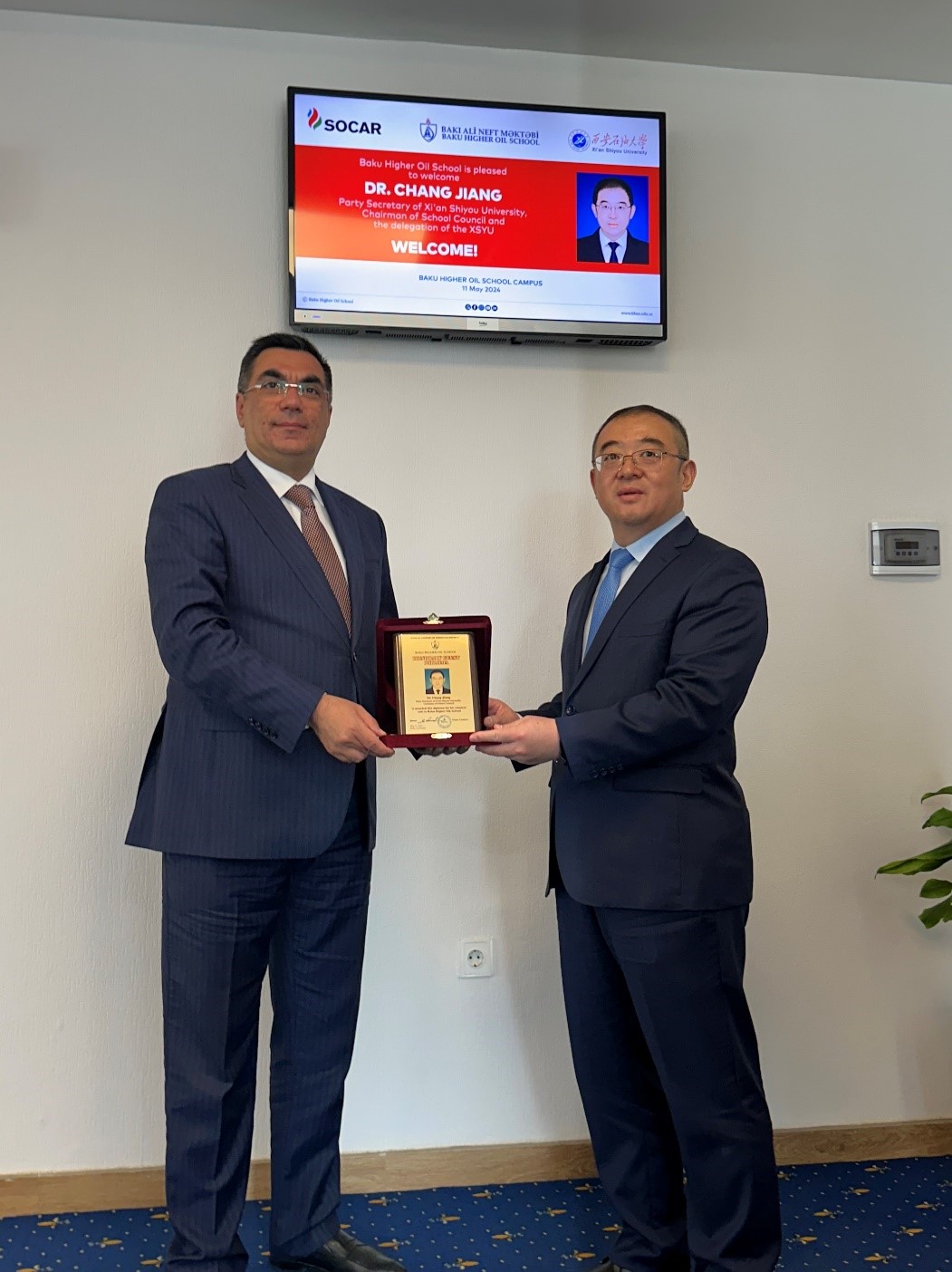 11日上午,常江一行訪問巴庫高等石油學(xué)校,與該校校長加西莫夫舉行會談。加西莫夫等校方領(lǐng)導(dǎo)對常江一行來訪高度重視、熱情接待。代表團(tuán)到訪時,該校在主要樓宇及會場顯示屏全程顯示代表團(tuán)來訪歡迎頁面,現(xiàn)場氛圍熱烈。常江介紹了我校發(fā)展歷程和國際化辦學(xué)成就,特別介紹了我校新能源領(lǐng)域的主要研究方向和相關(guān)科研成果。加西莫夫介紹了該校發(fā)展歷史、專業(yè)設(shè)置、人才培養(yǎng)、國際合作等情況,表達(dá)了在學(xué)生交換、教師互派、可再生能源研究等領(lǐng)域的廣泛合作意愿。