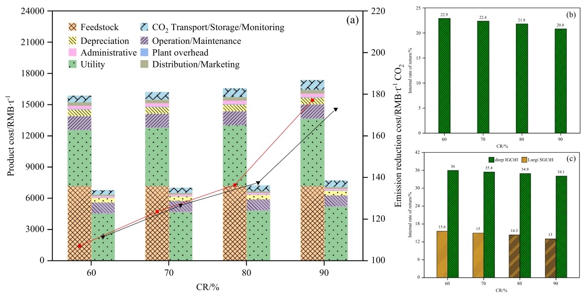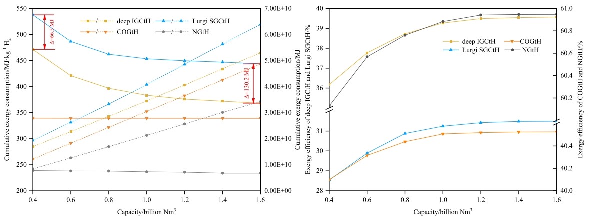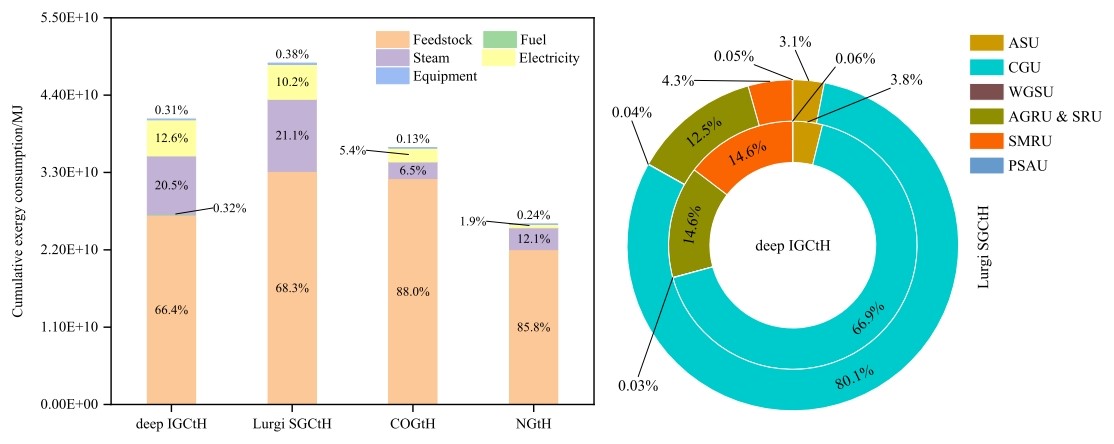 該成果基于世界上唯一的千米級(jí)深部煤炭原位氣化試驗(yàn)數(shù)據(jù),運(yùn)用?分析方法,以?平衡方程為基礎(chǔ),結(jié)合過程模擬手段,計(jì)算了深部煤炭原位氣化制氫從原煤開始到氫氣產(chǎn)品產(chǎn)出的?損失、分布,將?損失細(xì)分為可避免/不可避免內(nèi)部損失與可避免/不可避免外部損失四類,進(jìn)一步分析用能薄弱環(huán)節(jié),確定提高?效率的方法、手段。同時(shí),針對傳統(tǒng)?分析方法視角下效率指標(biāo)存在?不等價(jià)與無法計(jì)入非連續(xù)投入能量等問題,創(chuàng)新提出以考慮設(shè)備因素的積累?消耗(CExC)作為衡量過程?效率的指標(biāo),據(jù)此明確深部煤炭原位氣化制氫在效率方面的競爭力。結(jié)果表明,深部煤炭原位氣化制氫?損失中存在39.9%的不可避免,而甲烷重整和深部地下氣化具有最大的改進(jìn)潛力,充分說明通過改進(jìn)其他過程單元或優(yōu)化工藝結(jié)構(gòu)可實(shí)現(xiàn)熱力學(xué)性能的改善。在產(chǎn)出每千克氫氣時(shí)深部煤炭原位氣化制氫的CExC僅為傳統(tǒng)煤炭地面氣化制氫的83.6%,表明其是一種更高效的路線,優(yōu)勢隨著規(guī)模的增大會(huì)更加明顯,同時(shí)投資、成本方面相比后者也具有顯著優(yōu)勢。