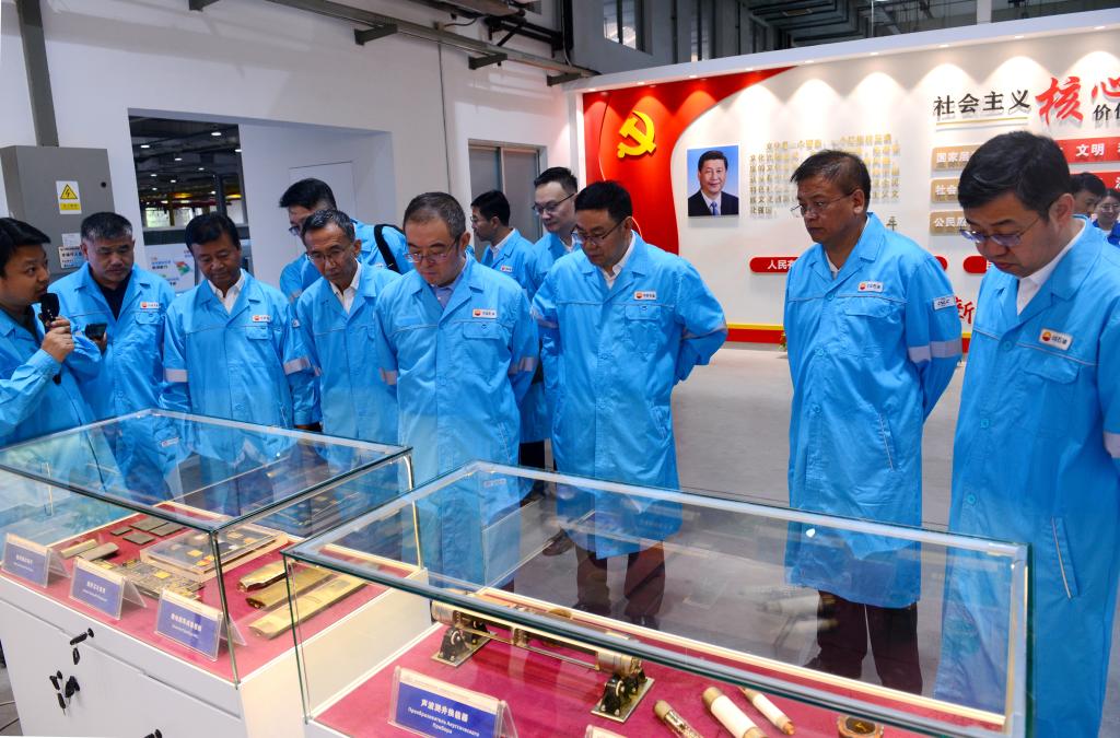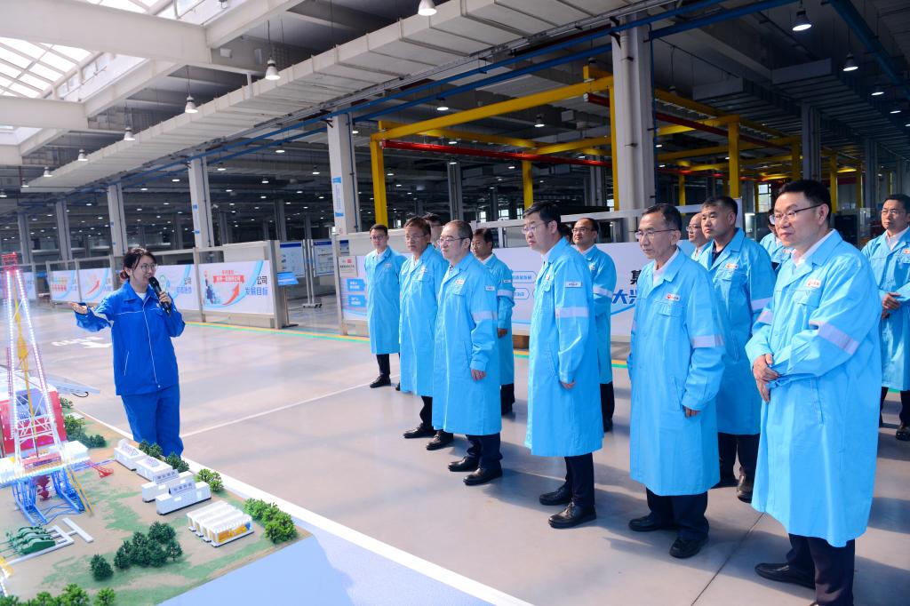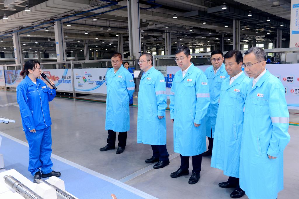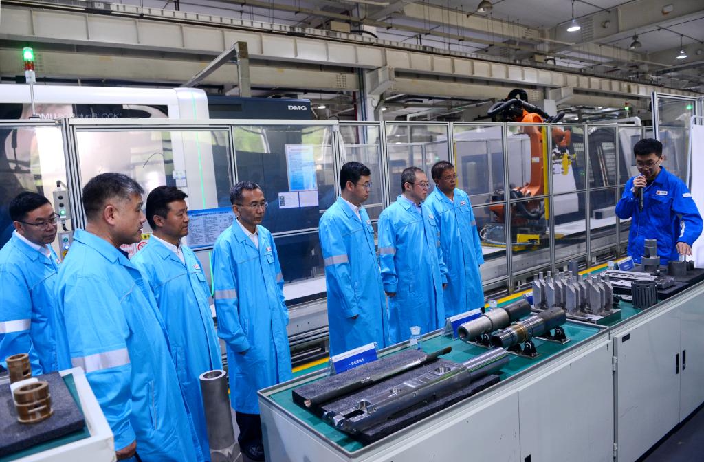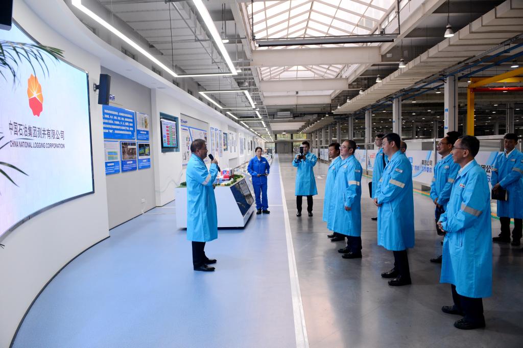 常江、王進(jìn)富一行在中國石油集團(tuán)測井有限公司執(zhí)行董事、黨委書記金明權(quán)陪同下,參觀了公司成套裝備產(chǎn)業(yè)化工房、智能制造車間,聽取公司關(guān)鍵技術(shù)產(chǎn)品發(fā)展歷程、應(yīng)用情況等方面的介紹,現(xiàn)場觀摩了智能制造車間實(shí)際運(yùn)轉(zhuǎn)情況。在園區(qū),金明權(quán)向常江、王進(jìn)富等介紹了超深穿透射孔器穿孔性能,常江、王進(jìn)富就關(guān)心的問題與金明權(quán)不時(shí)駐足交流。