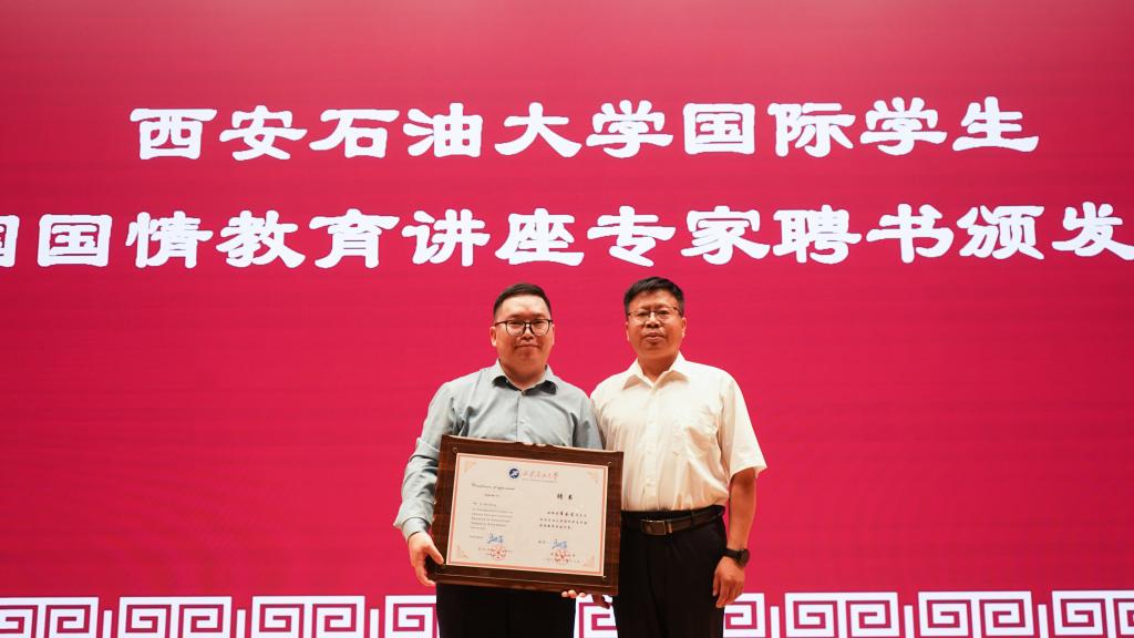 隨后,張驍勇分別為本次中國國情教育講座專家西北大學(xué)絲綢之路研究院副院長席會東副教授、陜西省民俗學(xué)會副會長劉國鋒頒發(fā)“西安石油大學(xué)國際學(xué)生中國國情教育講座專家”聘書。