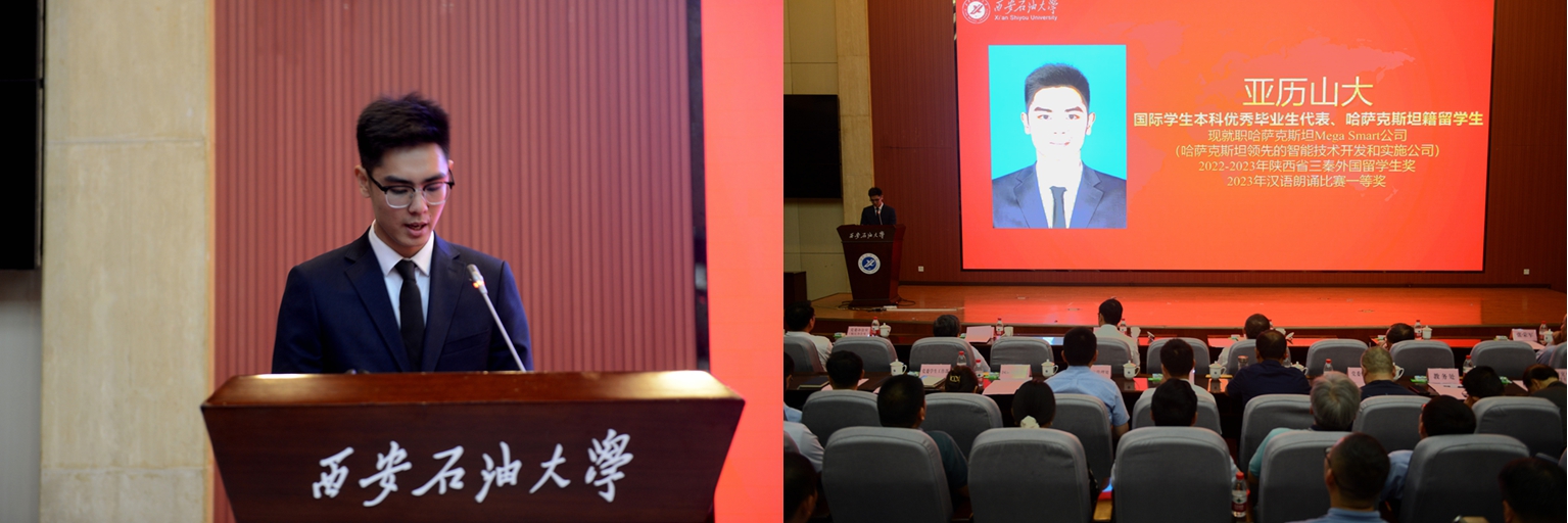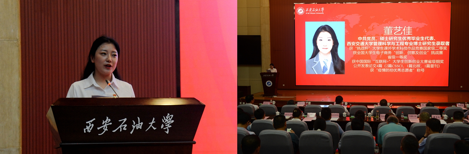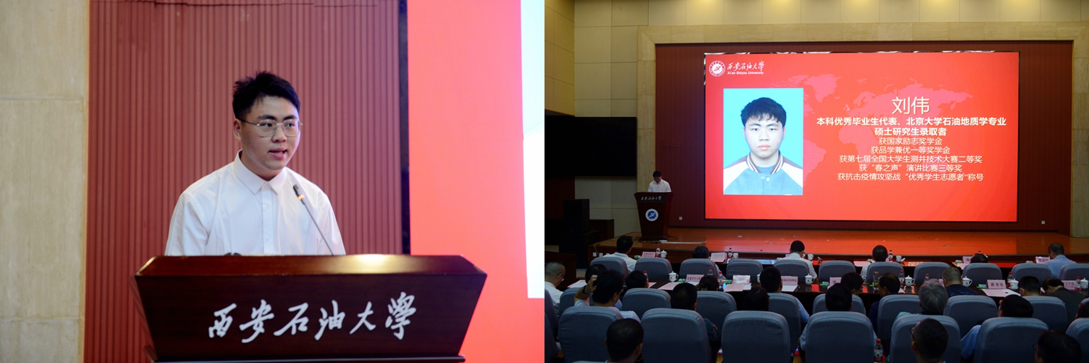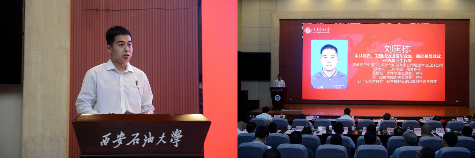 中共黨員、陜西省大學(xué)生自強之星、陜西好青年榮譽稱號獲得者,石油工程學(xué)院學(xué)生梁歡;本科優(yōu)秀畢業(yè)生代表、北京大學(xué)石油地質(zhì)學(xué)專業(yè)碩士研究生錄取者,地球科學(xué)與工程學(xué)院學(xué)生劉偉;國際學(xué)生本科優(yōu)秀畢業(yè)生代表、哈薩克斯坦籍留學(xué)生,國際教育學(xué)院學(xué)生亞歷山大;中共黨員、碩士研究生優(yōu)秀畢業(yè)生代表、西安交通大學(xué)管理科學(xué)與工程專業(yè)博士研究生錄取者,經(jīng)濟(jì)管理學(xué)院學(xué)生董藝佳;中共黨員、衛(wèi)國戍邊退役畢業(yè)生代表、西部基層就業(yè)優(yōu)秀畢業(yè)生代表,石油工程學(xué)院學(xué)生劉國棟分別作了交流發(fā)言。