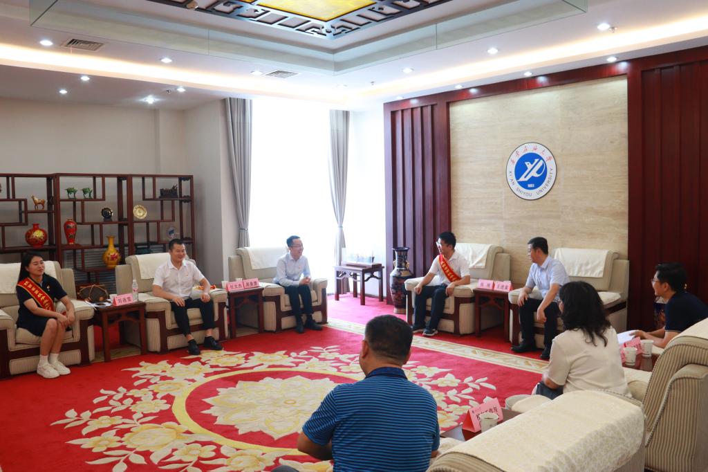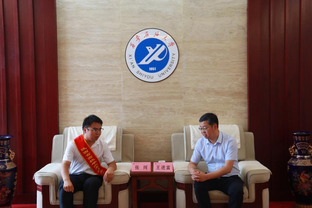會前,校長王進富親切會見了報告團一行。王進富對5位優(yōu)秀畢業(yè)生代表來校作報告表示歡迎和感謝,對他們扎根基層、報效祖國、服務人民的先進事跡表示贊揚與肯定。他指出,畢業(yè)生建功立業(yè)先進事跡報告活動的舉辦,就是以先進榜樣為力量,引領廣大學生樹立正確的學習觀、就業(yè)觀和人生觀,立志做有理想、敢擔當、能吃苦、肯奮斗的新時代好青年。他表示,學校將以此次分享會為契機,充分挖掘學校優(yōu)秀校友先進事跡,引導廣大同學向身邊的榜樣和先進看齊,賡續(xù)紅色血脈,弘揚鐵人精神,在新時代的廣闊天地綻放青春之花,同時也希望校友張珂(我校石工院2019屆本科畢業(yè)生)能夠一如既往地支持母校發(fā)展。