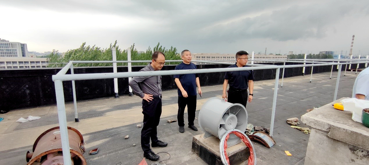 在12號學生宿舍樓頂——消防專項行動學生宿舍整改項目施工現(xiàn)場,張驍勇、趙健詳細了解樓頂消防排風軸流風機的更換進展情況和室內(nèi)煙感更新維護進度安排,強調(diào)要嚴格對照消防標準,加快施工進度,保證工程質(zhì)量,確保盡快完成整改任務(wù)。