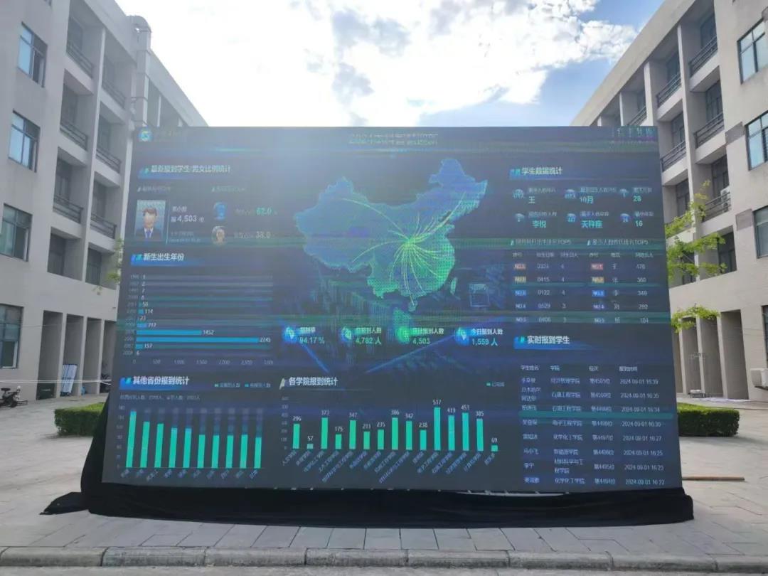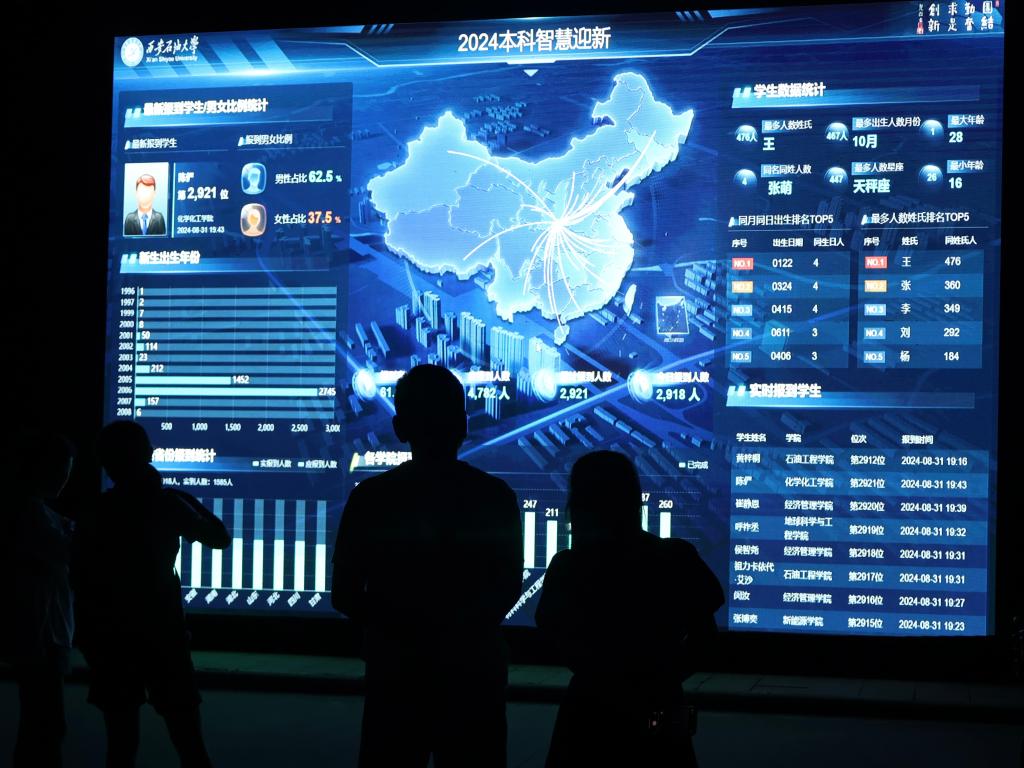 迎新現(xiàn)場設(shè)立了網(wǎng)絡(luò)可視化大數(shù)據(jù)電子屏幕,實(shí)時(shí)呈現(xiàn)全校本科新生報(bào)到情況,包含學(xué)生基本信息、所在省份,及有多少人與該名同學(xué)來自相同的省份、高中、相同的生日、姓氏、名字等有趣的信息,直觀展現(xiàn)出新生從祖國各地匯聚到西安石油大學(xué)的震撼場面。