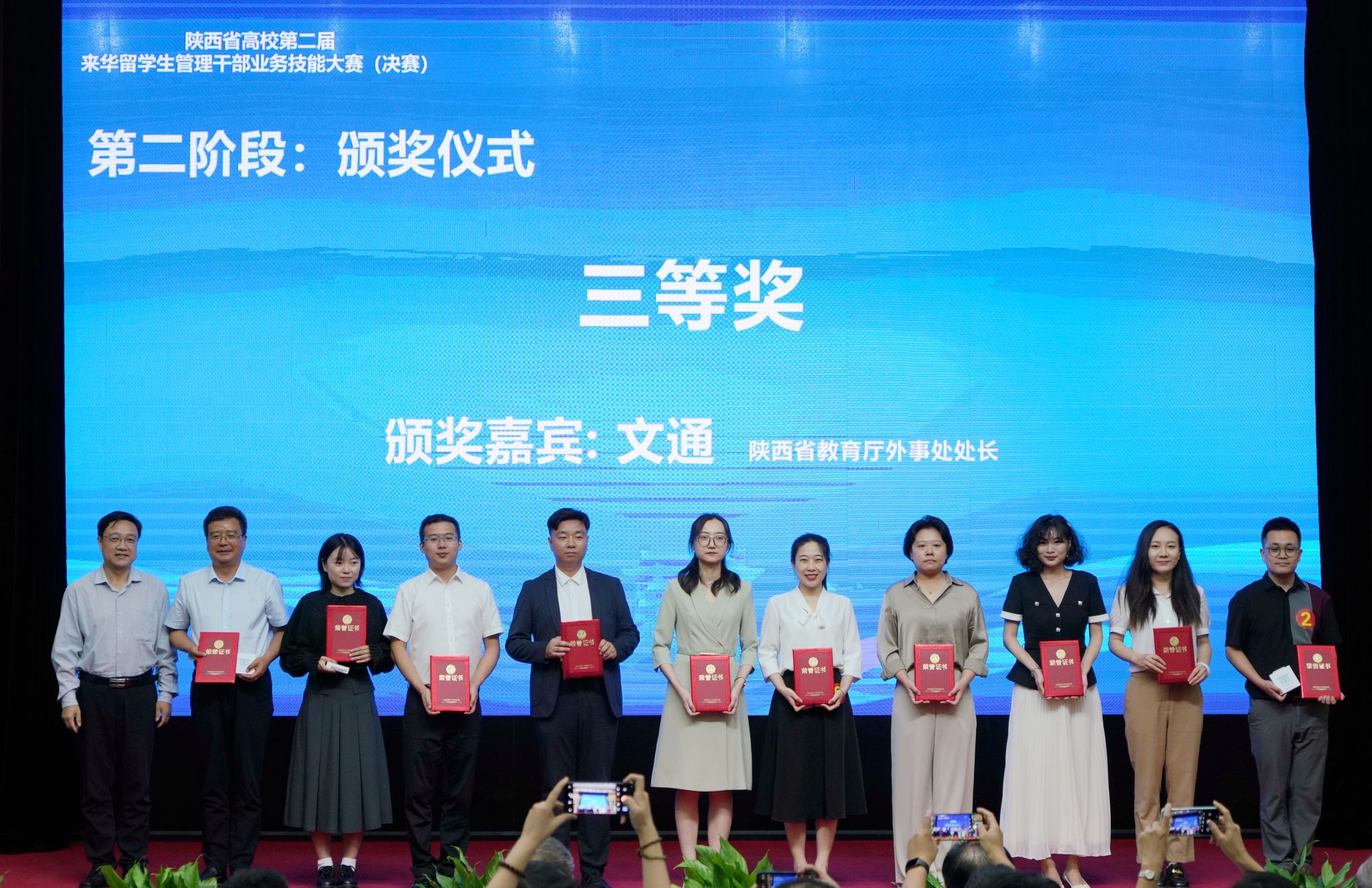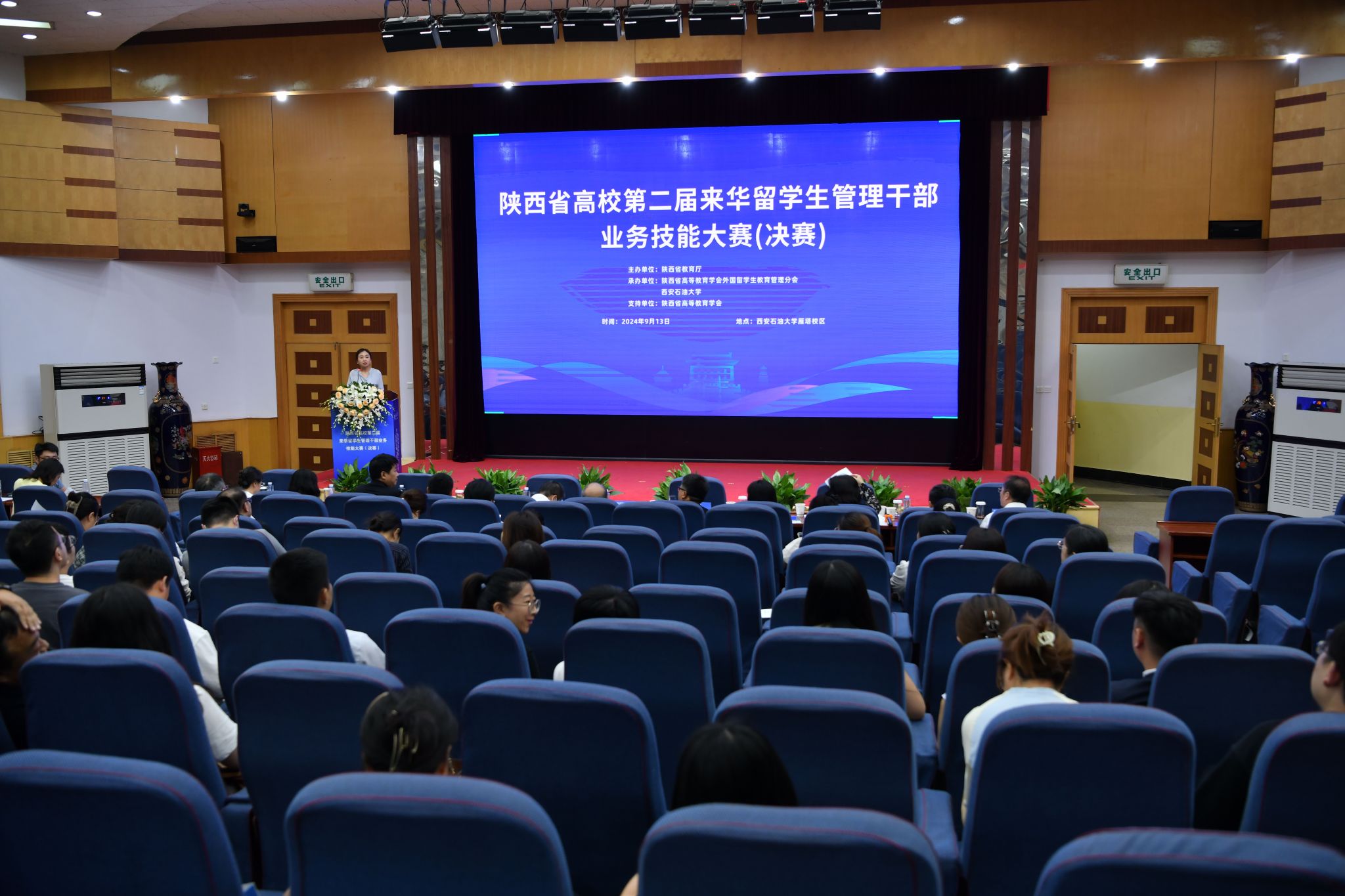 2024年9月13日下午,由陜西省教育廳、陜西省高等教育學(xué)會主辦,陜西省高等教育學(xué)會外國留學(xué)生教育管理分會、西安石油大學(xué)承辦的陜西省高校第二屆來華留學(xué)生管理干部業(yè)務(wù)技能大賽(決賽)在我校雁塔校區(qū)成功舉辦。中共陜西省委教育工委副書記王海波,西安石油大學(xué)黨委書記常江,陜西省高等教育學(xué)會副會長、我校原黨委書記惠泱河,省教育廳對外合作與交流處處長文通等出席大賽頒獎儀式,并分別為一、二、三等獎獲得者頒發(fā)獲獎證書和紀(jì)念品,副校長張榮軍主持頒獎儀式。