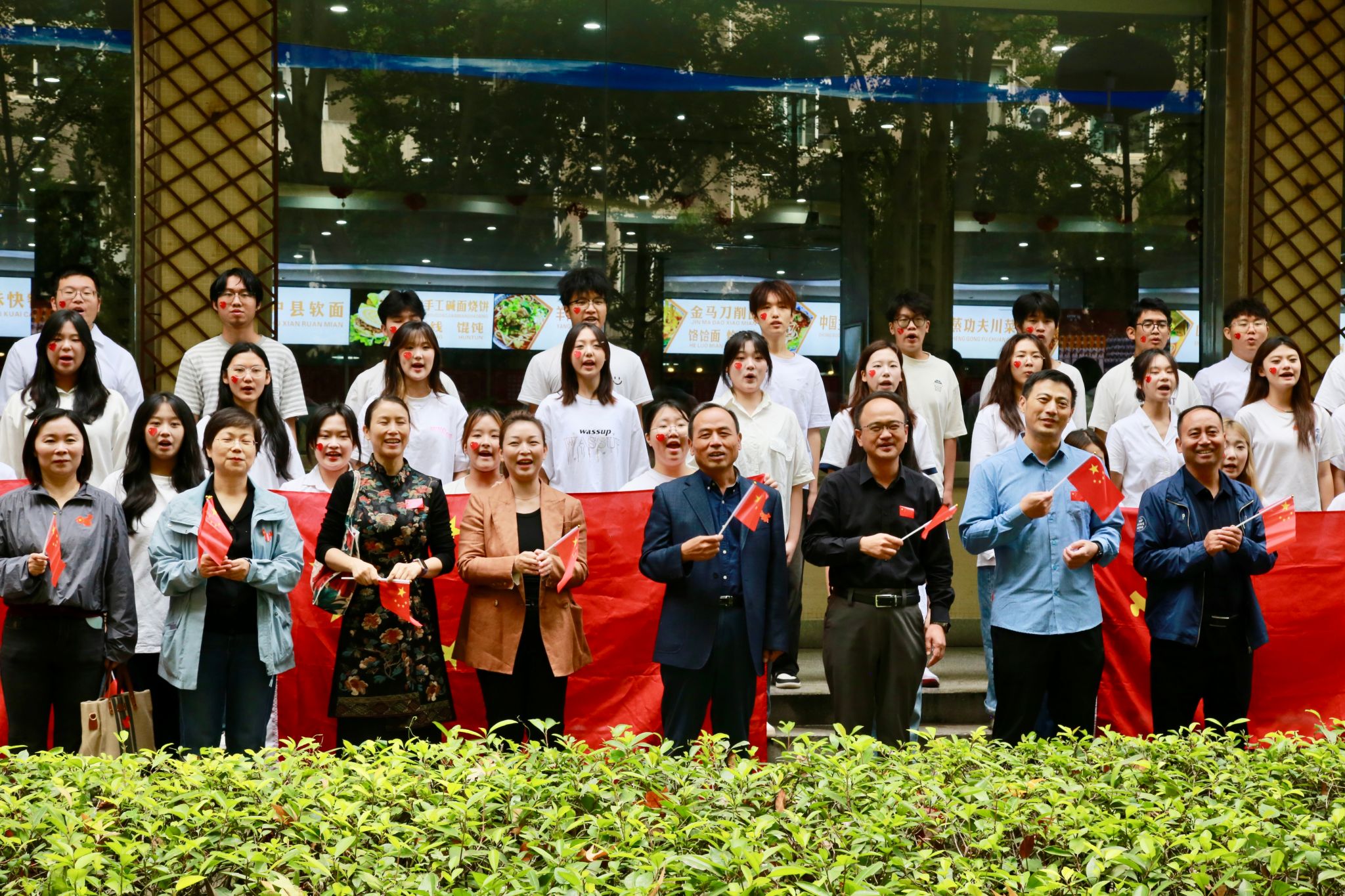 中午12點,參加快閃活動的學(xué)生在學(xué)校學(xué)生餐廳門前集合,活動在朱玥、馮洋洋兩位老師領(lǐng)唱的歌曲《五星紅旗》中拉開序幕。“五星紅旗啊五星紅旗,你將中華民族的心連在了一起。五星紅旗啊五星紅旗,你讓全世界中國人揚眉吐氣?!备S著歌詞,在場師生紛紛舉起手中的五星紅旗,跟著節(jié)奏的律動揮舞,表達著對祖國的無限敬仰與熱愛。