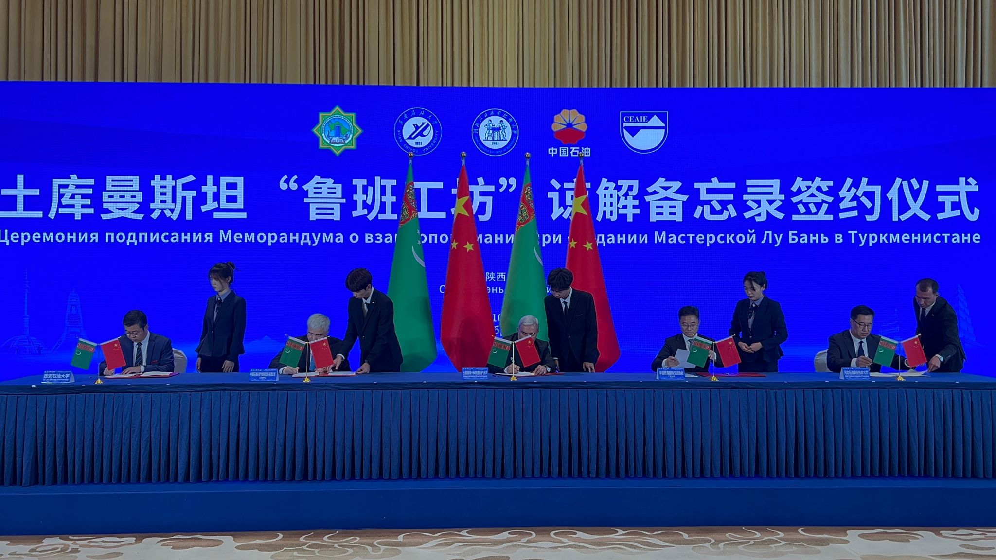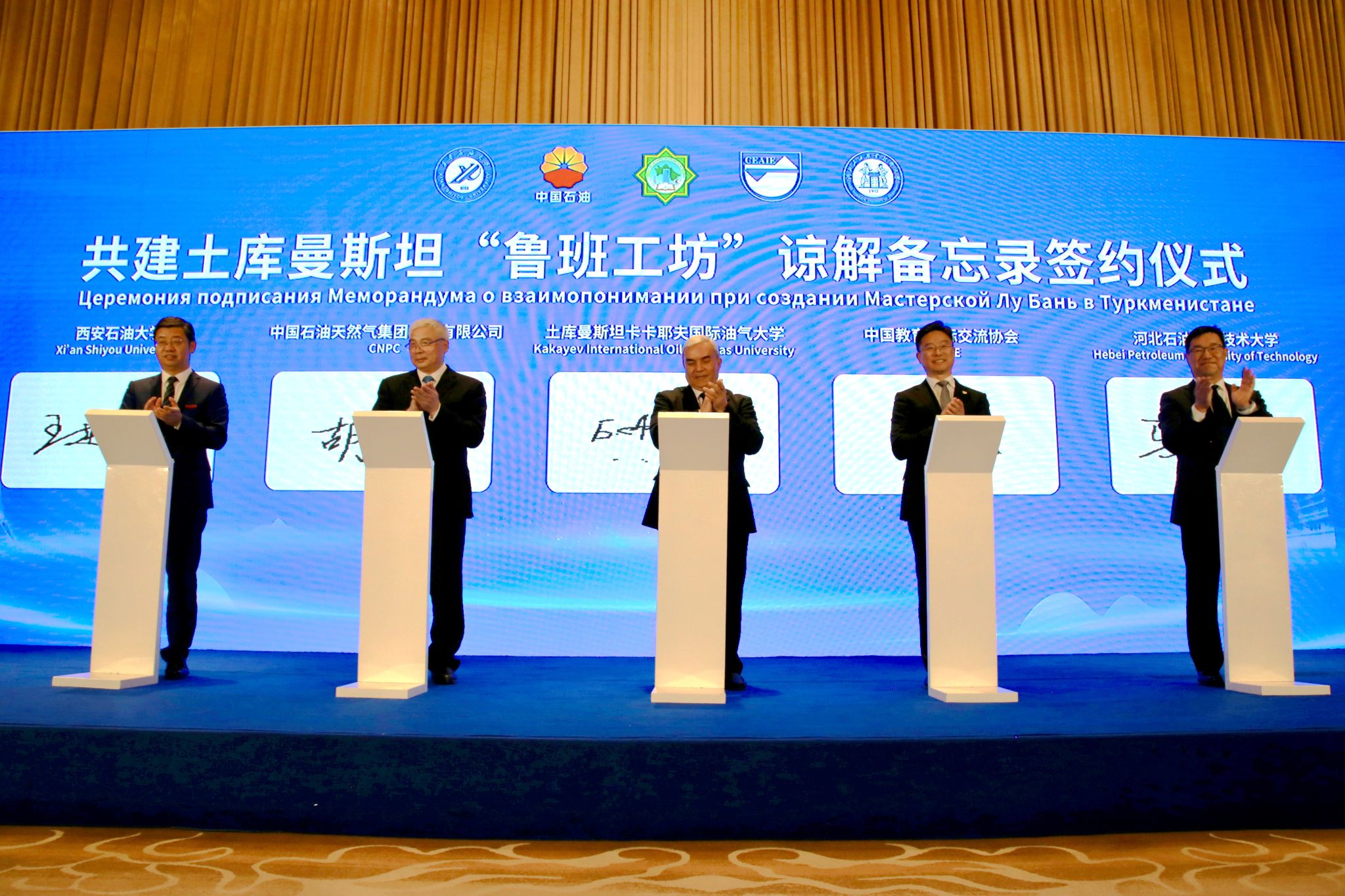 18日下午,共建土庫曼斯坦“魯班工坊”諒解備忘錄簽約儀式在陜西賓館成功舉行。土庫曼斯坦卡卡耶夫油氣大學(xué)校長拜拉姆穆拉特·阿塔馬諾夫、西安石油大學(xué)校長王進富、河北石油職業(yè)技術(shù)大學(xué)副校長馬顯才、中國教育國際交流協(xié)會秘書長楊軍、中國石油天然氣集團有限公司人力資源部副總經(jīng)理胡紅民分別代表中土共建各方共同簽署《土庫曼斯坦魯班工坊諒解備忘錄》。