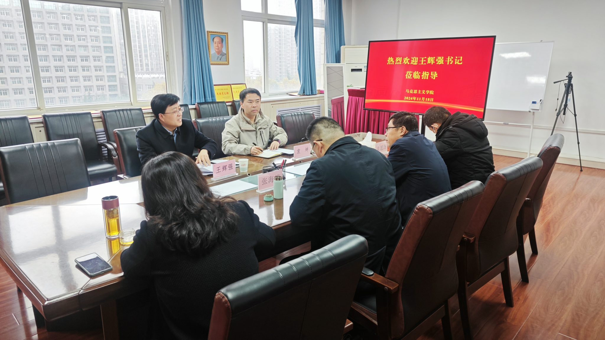為推動學(xué)習(xí)貫徹落實習(xí)近平總書記關(guān)于思政課建設(shè)的重要指示精神,11月18日下午,校黨委副書記、紀(jì)委書記、監(jiān)察專員王輝強一行到馬克思主義學(xué)院開展思政課建設(shè)專題調(diào)研監(jiān)督。馬克思主義學(xué)院班子成員和教師代表、紀(jì)委綜合室負(fù)責(zé)人參加調(diào)研監(jiān)督座談會。