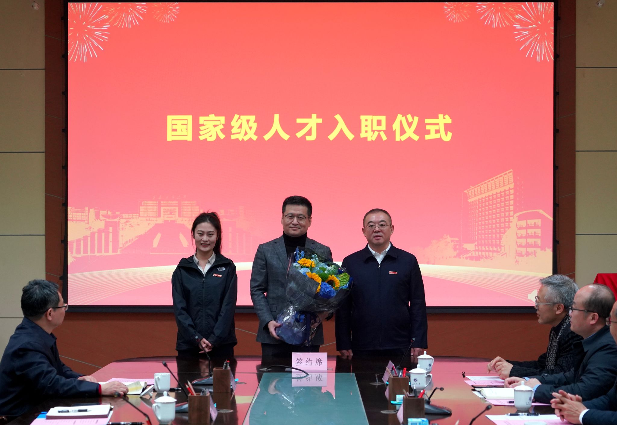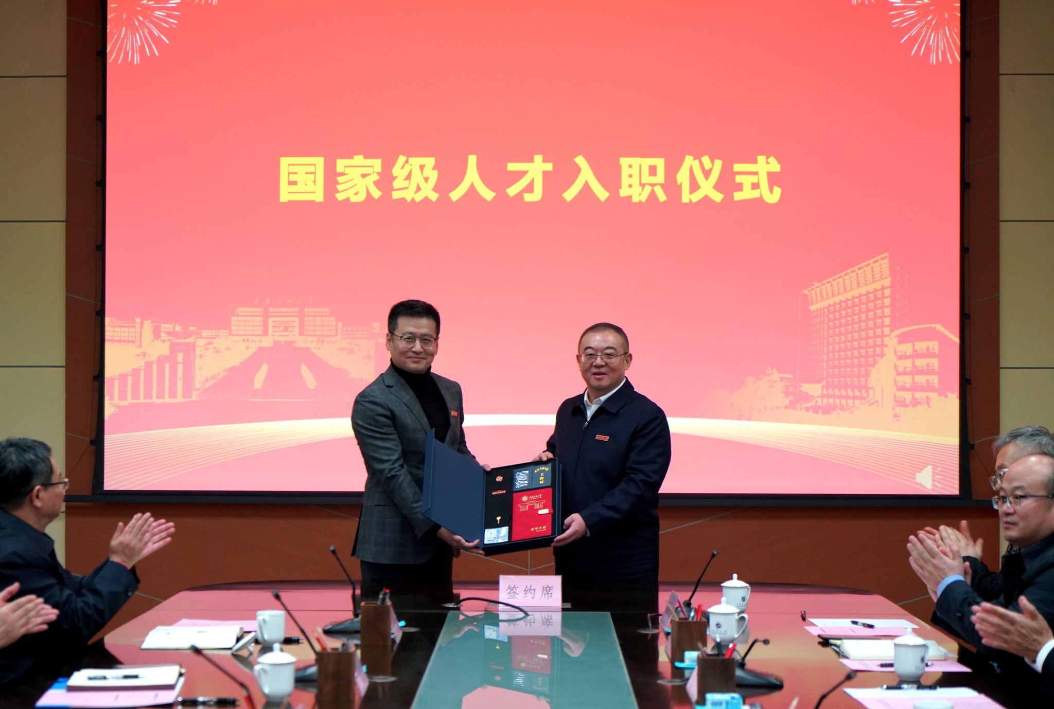 常江為崔仕章教授佩戴?;詹㈩C發(fā)了人才入職專屬禮盒。