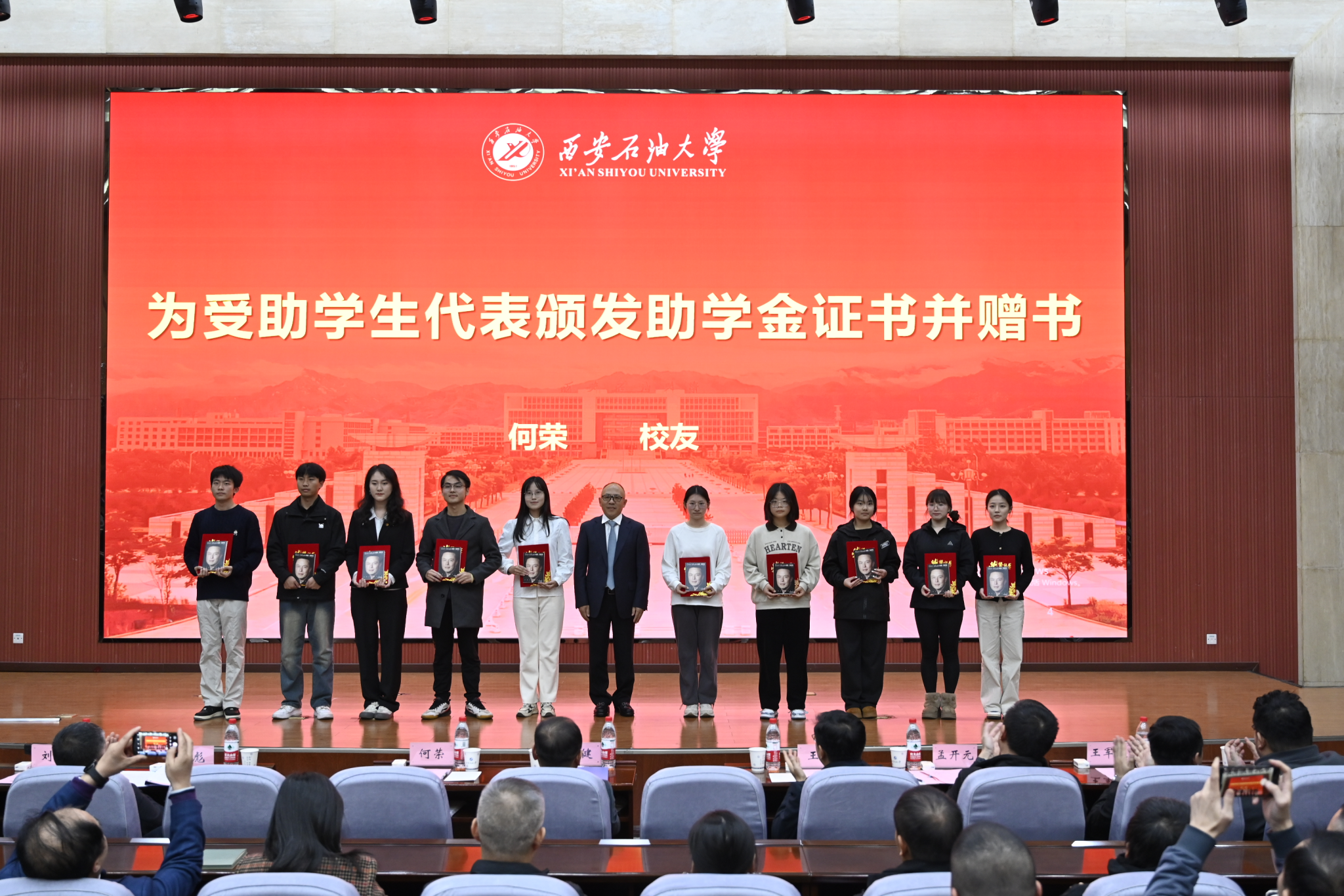 12月5日下午,西安石油大學2024年騰輝助學金發(fā)放儀式暨何榮校友報告會在鄠邑校區(qū)弘石學術報告廳舉行。西安石油大學副校長趙健,西安騰輝電氣有限公司總經(jīng)理、“騰輝助學金”主要出資人、西安石油大學1992屆校友何榮出席儀式。學生工作處、校友工作與合作交流處、校團委、機械工程學院負責人,西安騰輝電氣有限公司員工代表,2024年騰輝助學金獲得者,各院(系)師生代表共400余人參加了活動。