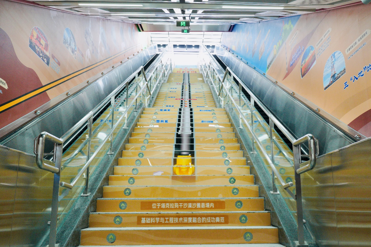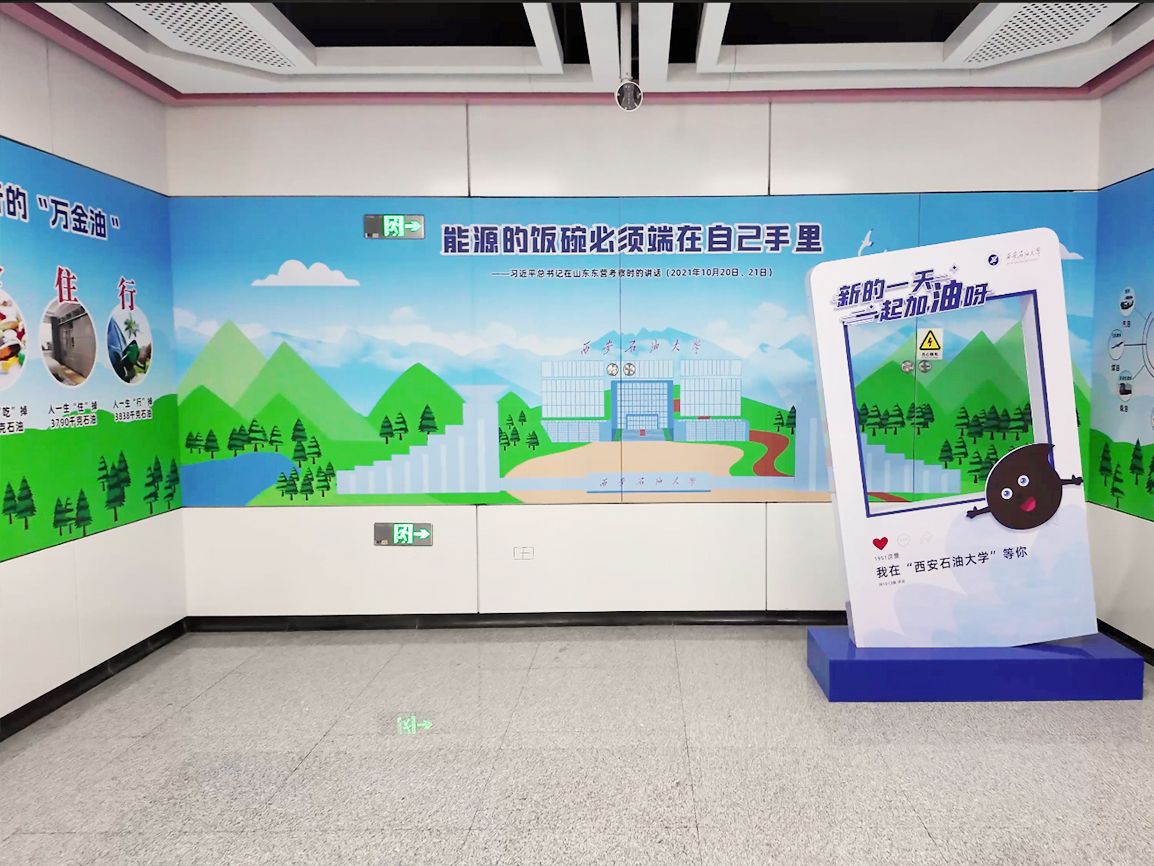 全部布展區(qū)域約102米,以模擬地下開采環(huán)境為背景,結(jié)合進(jìn)出站行進(jìn)路線,規(guī)劃了“七個(gè)場景”的布展內(nèi)容:1號(hào)墻“工業(yè)血液——中國石油工業(yè)的奮進(jìn)篇章”,依托進(jìn)站下行扶梯,再現(xiàn)了石油的最早記錄和中國石油工業(yè)從起步到壯大的輝煌歷程,展示了我國在石油技術(shù)、裝備、合作等領(lǐng)域的新突破;2號(hào)墻“石油七十二變”,依托長廊側(cè)面,展示了石油在生產(chǎn)生活中的具體應(yīng)用場景;3號(hào)墻依托出站時(shí)映入眼簾的正面墻,展示了習(xí)近平總書記關(guān)于國家能源安全的重要論述,同時(shí)融入我校鄠邑校區(qū)經(jīng)典元素剪影(北大門、圖書館、終南山);4號(hào)墻“衣食住行的萬金油”,依托進(jìn)站下樓時(shí)首先映入眼簾的正面墻體,以趣味數(shù)字量化人們在生活中使用的石油;在4號(hào)墻遠(yuǎn)端,強(qiáng)調(diào)展出了“為祖國加油、為民族爭氣”和“石油精神辦學(xué) 鐵人精神育人 延安精神鑄魂”的理念;5號(hào)墻“西石大智慧”是離出站口最近的必經(jīng)墻體,展示了我校優(yōu)秀科研成果服務(wù)國家重大應(yīng)用場景;6號(hào)墻“油氣產(chǎn)業(yè)鏈全景探索”,依托出站上行扶梯墻體,對油氣產(chǎn)業(yè)上中下游進(jìn)行了全階段科普展示;最后,利用出站樓梯的側(cè)立面,立體展示了亞洲第一最深直井、我國首口萬米科探井(深地塔科一井)的探地效果和地球的年代地層。
