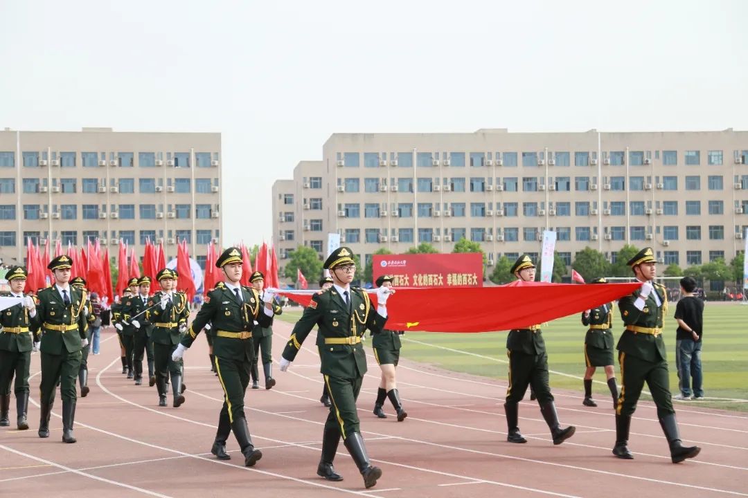 伴隨著《運(yùn)動(dòng)員進(jìn)行曲》的旋律,國(guó)旗、校旗、會(huì)旗方隊(duì),裁判員方隊(duì)和17支由師生組成的院(系)參賽代表隊(duì),以及6個(gè)工會(huì)代表隊(duì)以飽滿的熱情和精彩的表演依次步入運(yùn)動(dòng)會(huì)場(chǎng),有序通過(guò)主席臺(tái)接受檢閱。入場(chǎng)儀式上,全體師生精神抖擻、朝氣昂揚(yáng),嘹亮的口號(hào)、矯健的步伐,彰顯了西石大師生積極向上、拼搏進(jìn)取的精神面貌以及勇?lián)聲r(shí)代責(zé)任和使命的拳拳決心,各代表隊(duì)精彩的表演贏得全場(chǎng)觀眾熱烈的掌聲和歡呼聲。此刻,口號(hào)聲、歡騰聲響徹運(yùn)動(dòng)場(chǎng)的上空。