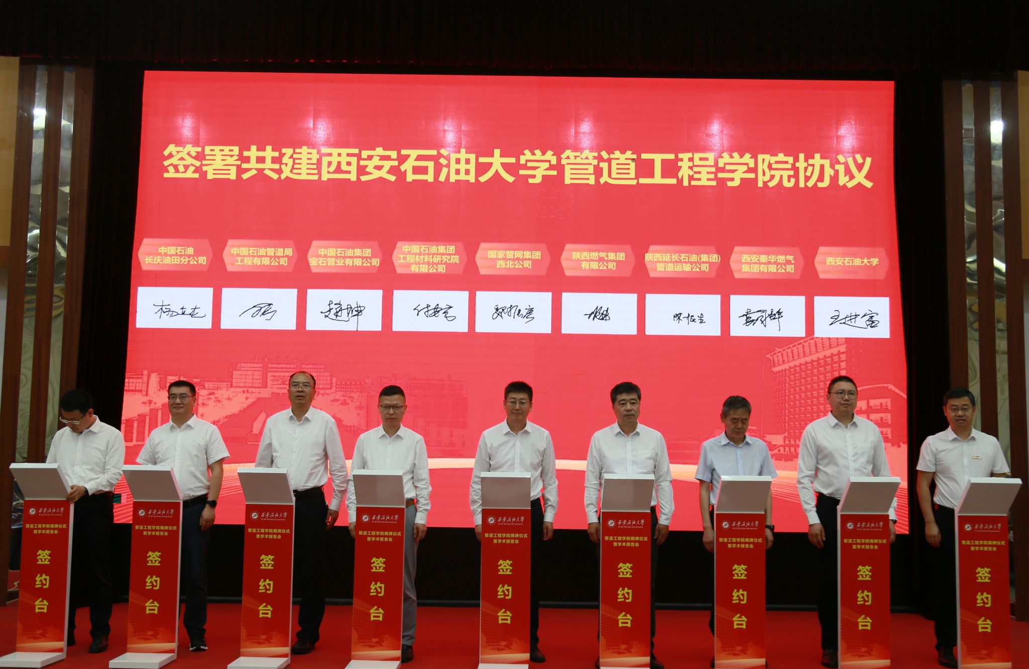 楊立龍副書記,劉廣仁副總經(jīng)理,趙坤首席專家,付安慶副總經(jīng)理,魏振宏副總經(jīng)理,胡恒進(jìn)總工程師,陳根生總監(jiān),袁國輝副總經(jīng)理,校長王進(jìn)富共同簽署共建管道工程學(xué)院協(xié)議。