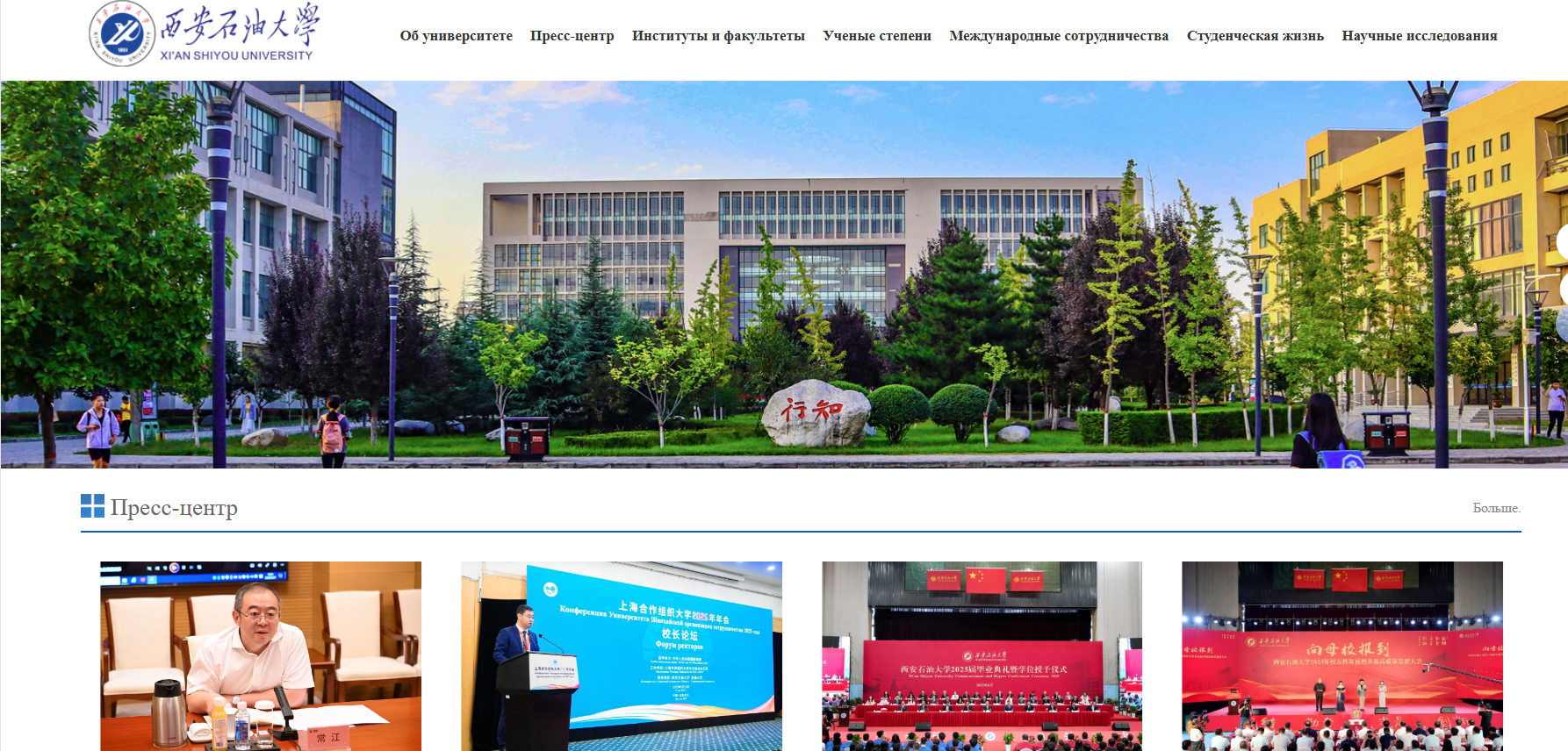俄文主頁(yè)聚焦學(xué)校核心發(fā)展成果,開(kāi)設(shè)學(xué)校概況(об университете)、新聞中心(Пресс-центр)、院系介紹(Институты и факультеты)、學(xué)術(shù)學(xué)位(Ученые степени)、國(guó)際合作(Международные сотрудничества)、校園生活(Студенческая жизнь)、科學(xué)研究(Научные исследования)等特色板塊,系統(tǒng)呈現(xiàn)學(xué)校在人才培養(yǎng)、科學(xué)研究、社會(huì)服務(wù)等方面的綜合實(shí)力,尤其突出國(guó)際化辦學(xué)的鮮明特色與豐碩成果,為俄語(yǔ)世界打開(kāi)一扇了解西石大的全新窗口。