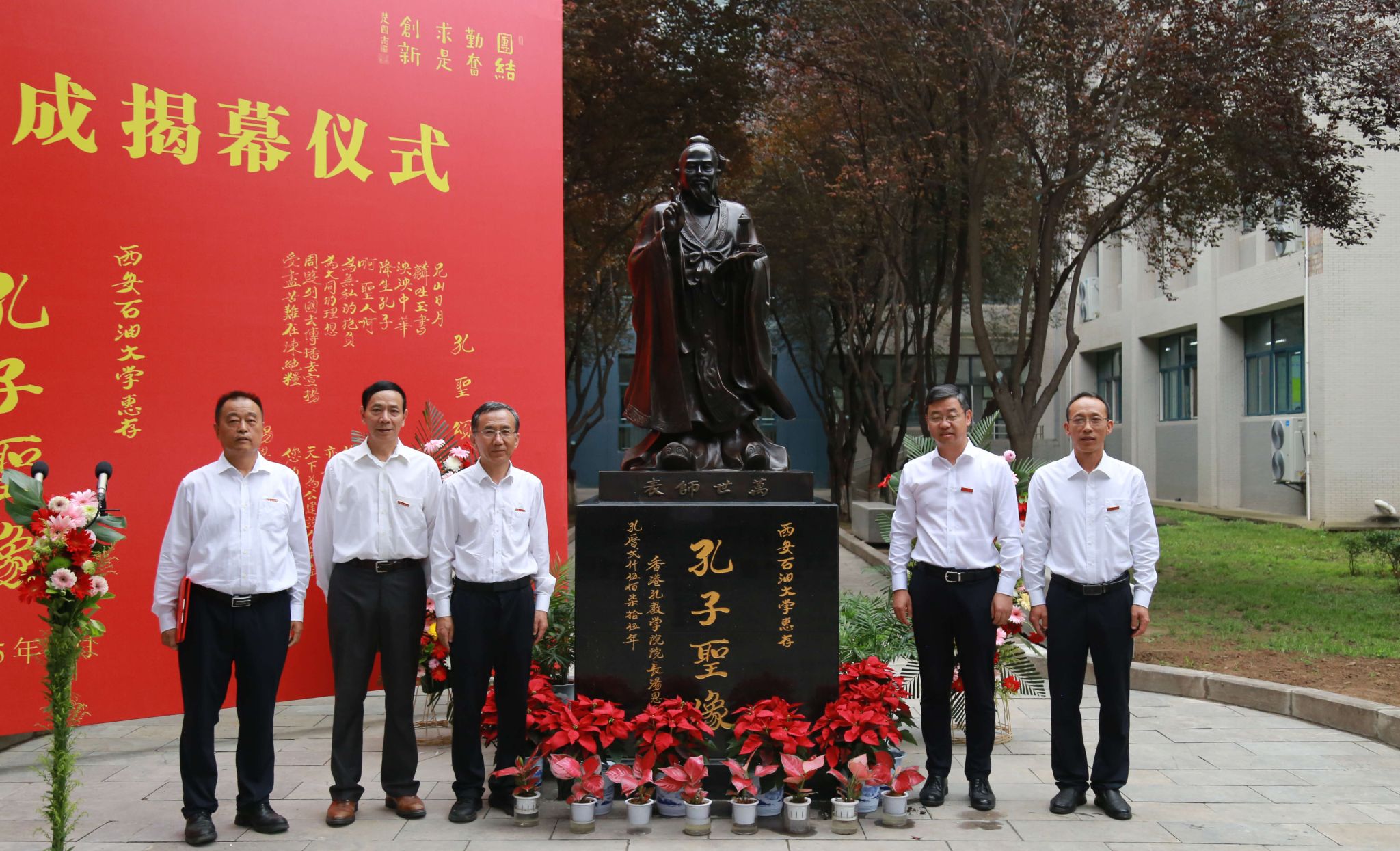 在全體與會人員的共同見證下,王進(jìn)富、張木、張君濤、周德勝共同為孔子銅像揭幕。全體領(lǐng)導(dǎo)、師生代表向孔子銅像行鞠躬禮。