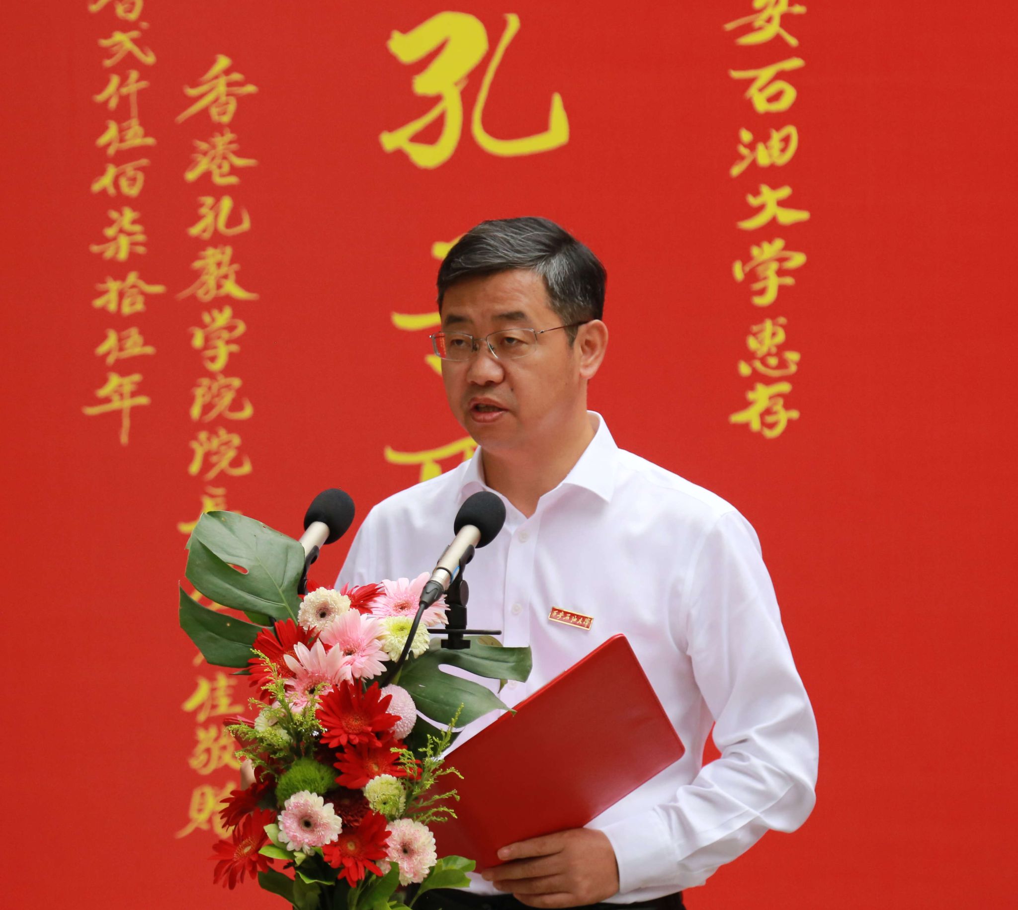 王進(jìn)富在致辭中指出,孔子是我國古代偉大的思想家、教育家,儒家學(xué)派創(chuàng)始人。其提出的“有教無類”“因材施教”“溫故知新”等教育理念,至今仍熠熠生輝;其倡導(dǎo)的“仁、義、禮、智、信”道德準(zhǔn)則,早已融入中華民族的精神血脈。在校園中樹立孔子像,既是對中華優(yōu)秀傳統(tǒng)文化的高度禮贊,也是對教育初心和師道精神的回歸與呼喚。他強調(diào),學(xué)校將以豎立孔子銅像為契機,進(jìn)一步推進(jìn)傳統(tǒng)文化教育與現(xiàn)代大學(xué)教育的深度融合,持續(xù)開展儒家經(jīng)典傳習(xí)、國學(xué)講座、師德主題教育等系列活動,引導(dǎo)師生從中華優(yōu)秀傳統(tǒng)文化中汲取智慧與力量,不斷增強文化自信與價值認(rèn)同。同時,學(xué)校也將繼續(xù)加強與海內(nèi)外文化教育機構(gòu)的合作,共同推動中華優(yōu)秀傳統(tǒng)文化創(chuàng)造性轉(zhuǎn)化、創(chuàng)新性發(fā)展。