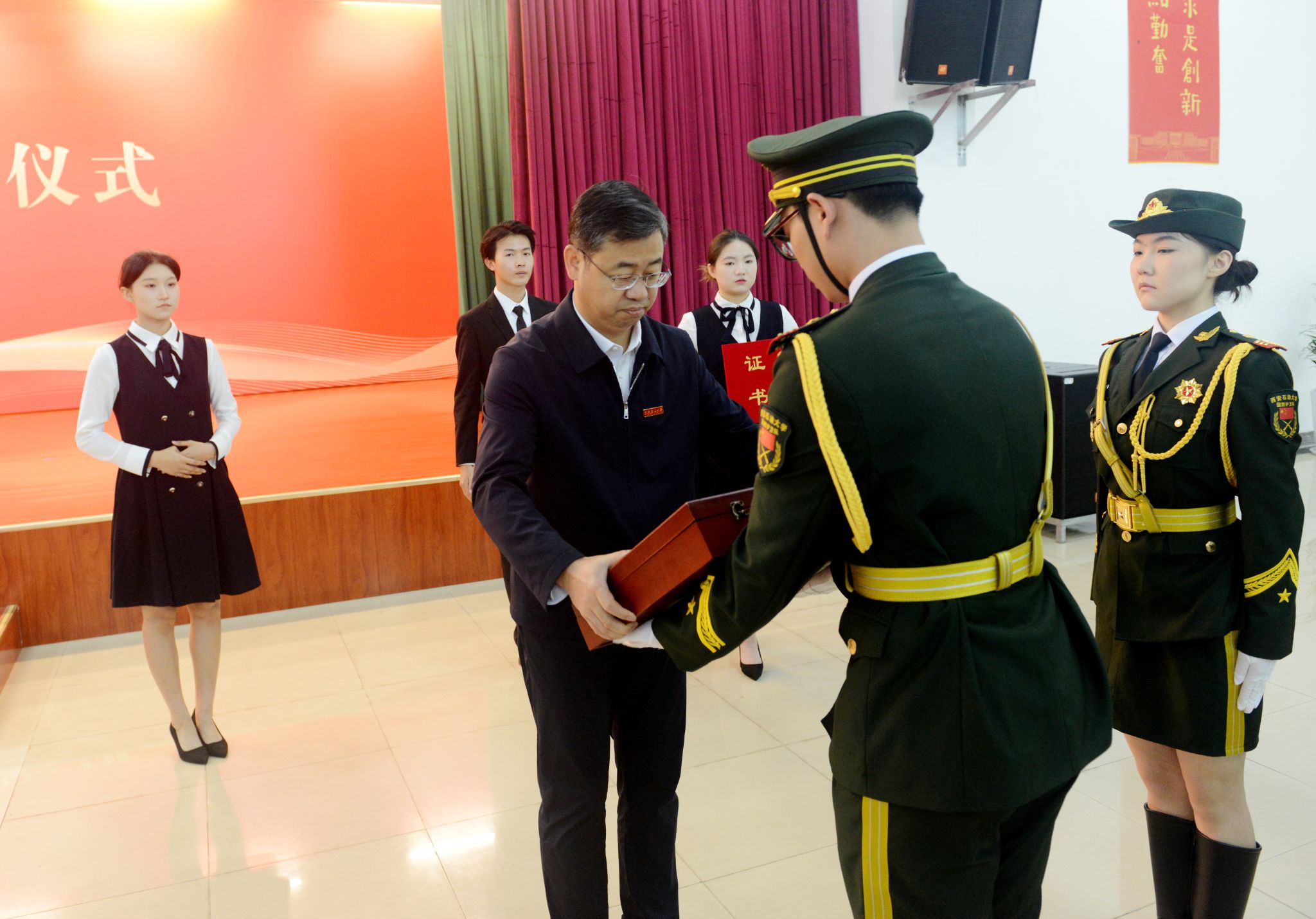 上午8時,儀式在莊嚴的氛圍中正式開始。校長王進富將獲贈的國旗及證書鄭重交予學校國旗護衛(wèi)隊,國旗護衛(wèi)隊隊員神情肅穆,步伐鏗鏘,莊嚴地護送國旗入場。這面國旗旗長5米、寬3.3米,為超大國旗,整幅旗面無拼接,五顆星由織造人員手工縫制,工藝特殊,承載著億萬中華兒女的深厚愛國情懷,也凝聚著我校建校70周年的特別紀念。