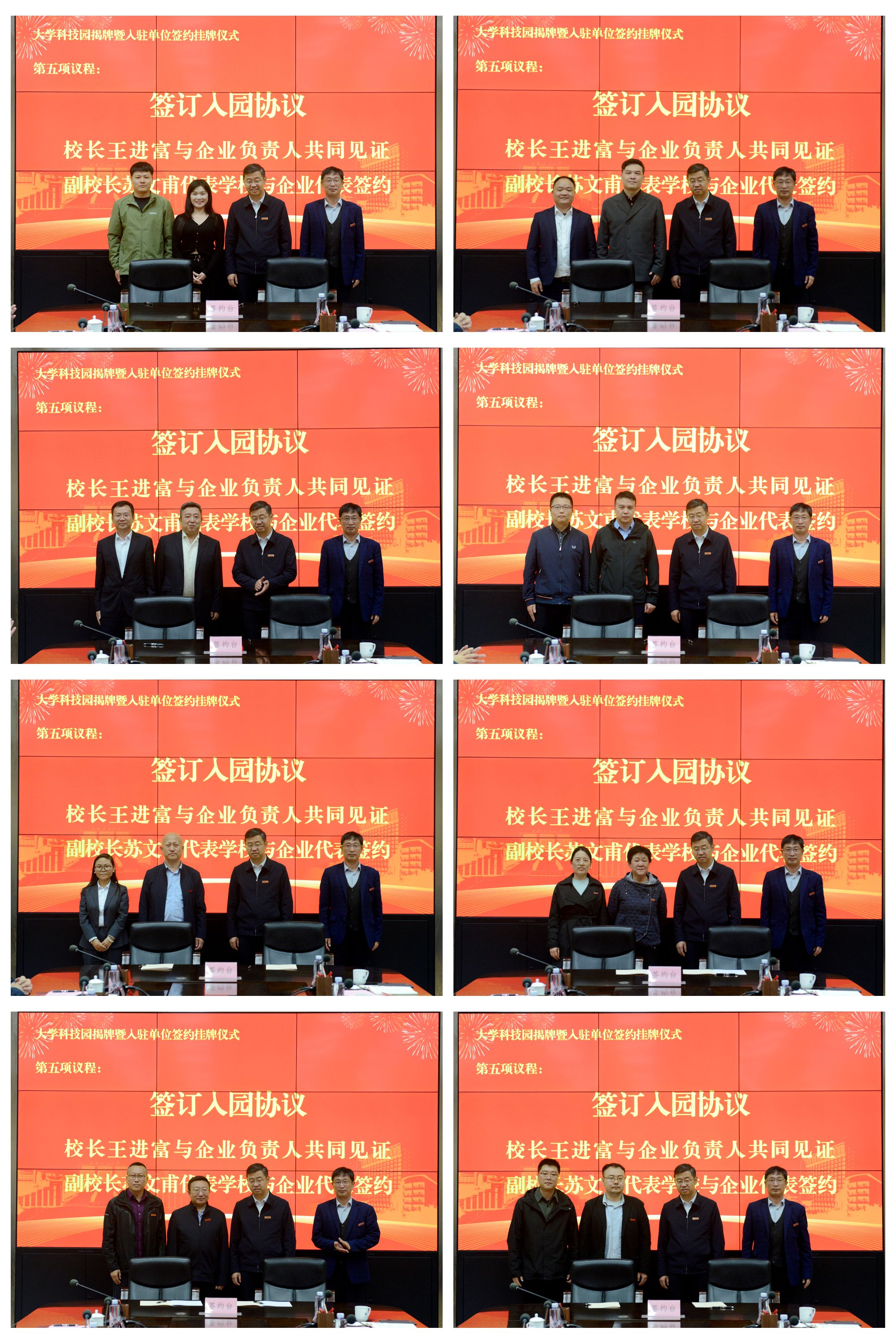 入駐意向協(xié)議簽訂環(huán)節(jié)中,在王進富校長的見證下,蘇文甫副校長代表學(xué)校分別與8家入駐企業(yè)代表簽約,標(biāo)志著校企資源共享、優(yōu)勢互補、協(xié)同創(chuàng)新的合作模式正式開啟。