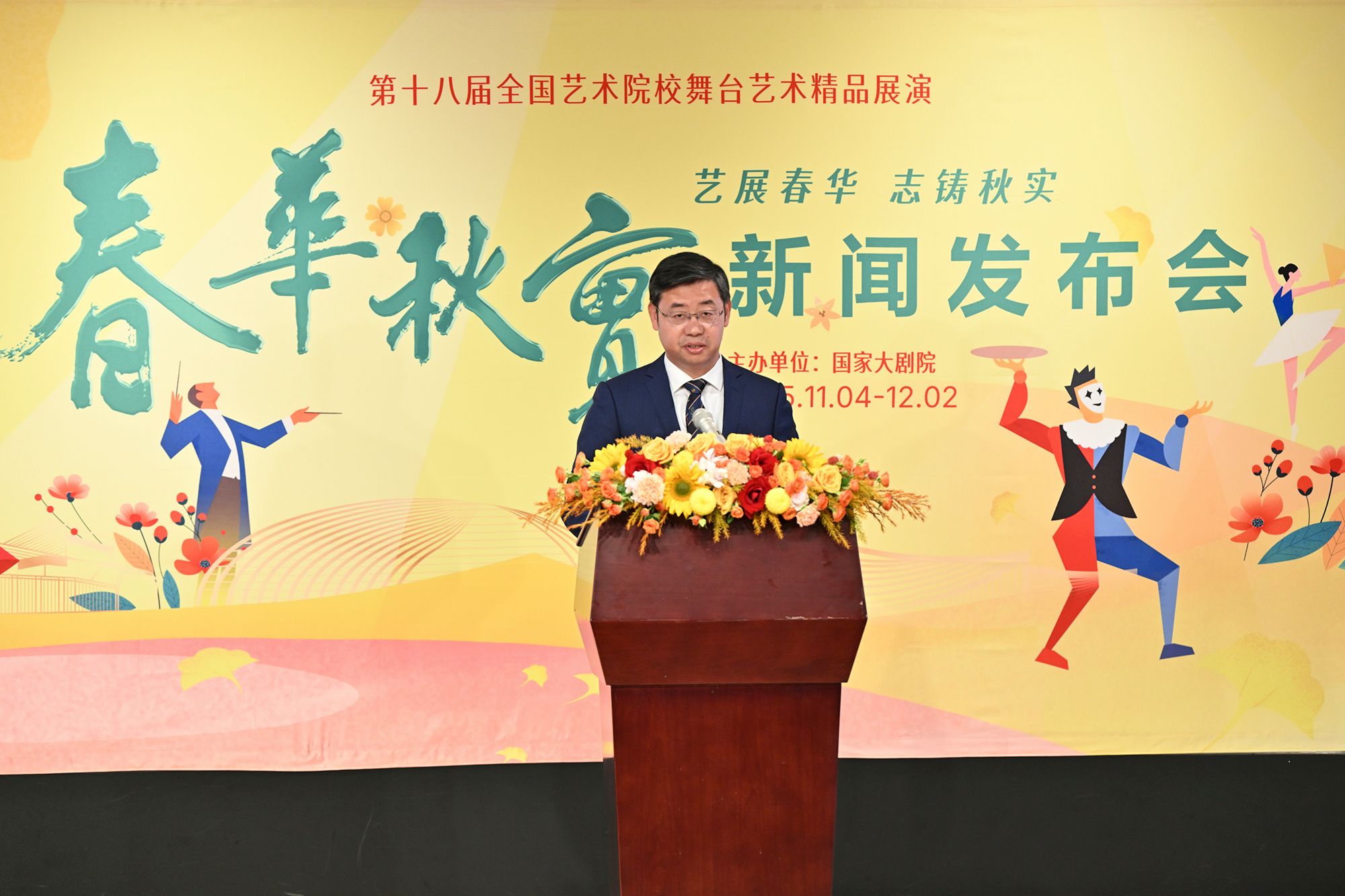 11月4日,國家大劇院第十八屆“春華秋實”全國藝術院校舞臺藝術精品展演新聞發(fā)布會成功舉行。國家大劇院黨組書記、院長王寧,教育部體育衛(wèi)生與藝術教育司副司長楊大研,文化和旅游部科技教育司副司長劉冬妍,中國科協(xié)宣傳文化部副部長李芳等領導出席,中央戲劇學院、上海戲劇學院、西安石油大學等參演院校負責人共同參加,新聞發(fā)布會由國家大劇院黨組成員、副院長王斑主持。校長王進富作為非藝術類院校代表受邀出席并作主旨發(fā)言。
