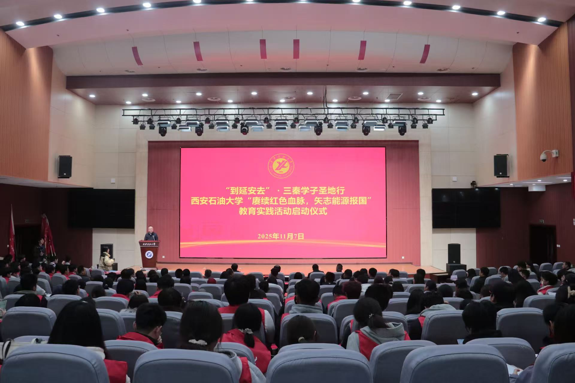 為深入貫徹習(xí)近平總書(shū)記關(guān)于“延安精神是黨的寶貴精神財(cái)富,要代代傳承下去”的重要指示精神,用好延安革命圣地豐富的紅色資源,充分發(fā)揮育人作用,根據(jù)陜西省委教育工委《關(guān)于組織開(kāi)展“到延安去”·三秦學(xué)子圣地行活動(dòng)的通知》要求,推動(dòng)紅色文化資源深度融入“大思政課”建設(shè)和立德樹(shù)人全過(guò)程,11月7日下午,學(xué)校在鄠邑校區(qū)弘石學(xué)術(shù)報(bào)告廳舉行“到延安去”?三秦學(xué)子圣地行—西安石油大學(xué)“賡續(xù)紅色血脈,矢志能源報(bào)國(guó)”教育實(shí)踐活動(dòng)啟動(dòng)儀式。副校長(zhǎng)種宇宏出席儀式并講話,黨委組織部、黨委學(xué)生工作部、校團(tuán)委、馬克思主義學(xué)院、繼續(xù)教育學(xué)院等單位負(fù)責(zé)人,各院(系)學(xué)生工作負(fù)責(zé)人,團(tuán)委(團(tuán)總支)書(shū)記,學(xué)生黨支部書(shū)記及預(yù)備黨員代表,第十八期校級(jí)青年馬克思主義者干部培訓(xùn)班優(yōu)秀學(xué)員代表,團(tuán)學(xué)骨干代表,2025級(jí)班級(jí)團(tuán)支部書(shū)記代表400余人參加儀式。