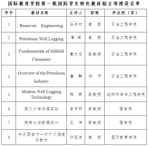 根據《西安石油大學關于開展國際學生特色教材立項建設的通知》要求,我院啟動了第一批校級國際學生特色教材立項建設工作。經各院(系)教師申請、學院組織專家評審、學院院務會研究,決定將《Reservoir Engineering》等8部教材列為我院第一批國際學生特色教材擬立項建設項目。本批教材建設期限為2年,起止時間為2017年11月至2019年11月。屆時學院將組織驗收,驗收時教材主編須提供國家正式出版社出版教材1部。現將擬立項建設教材名單公示如下: