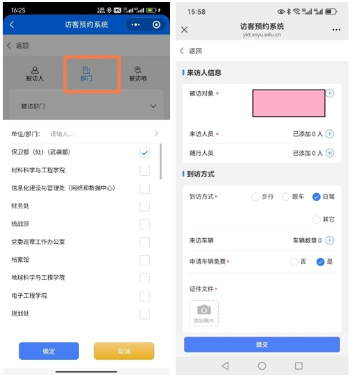 ⑤點擊被訪對象加號,選擇“部門”,點選被訪部門后確定,添加來訪人員姓名、數(shù)量、車牌號碼、出入時間等信息,選擇到訪方式以及是否申請免費等,上傳大型活動、交流會議學(xué)校批示件后提交。