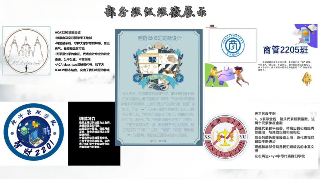 本次大賽參賽對象為學(xué)院2022級、2023級各班級,自11月初開始作品征集,鼓勵班級全體成員參與設(shè)計,群策群力,發(fā)揮自身特長。經(jīng)過首輪評審,共有11個班級進入決賽。在決賽中,各班以視頻、PPT、舞蹈、朗誦等形式全方位展示班級風(fēng)采。商管2305班以初心如磐,行穩(wěn)致遠(yuǎn),堅定信仰,奮楫篤行作為他們的行為規(guī)范,“在青春路上盡情展現(xiàn)自我”是他們的班級特色,班歌《我的未來式》體現(xiàn)了商管2305班同學(xué)對未來的期望與憧憬,以及敢于追夢,爭取圓夢的斗志與激情。智財2201將“智勇雙全,愛拼財會贏”作為本班的班訓(xùn),班徽設(shè)計主體以科技藍(lán)為主色調(diào),象征著信息和科技,融合信息網(wǎng)絡(luò)系統(tǒng),財會系統(tǒng)流程等設(shè)計元素。國貿(mào)2202班以“嚴(yán)于律己,寬以待人”為關(guān)鍵詞,勉勵每一位同學(xué)變得更好,更加優(yōu)秀?!凹纫鐾强?,又要腳踏實地”是他們的宣言。經(jīng)過激烈的角逐,商管2305班榮獲一等獎,智財2201班和國貿(mào)2202班榮獲二等獎,商務(wù)2301班、ACA2302班、商管2304班榮獲三等獎,商管2205班、金融2201班、ACA2202班、ACA2301班、商管2308班榮獲優(yōu)秀獎。