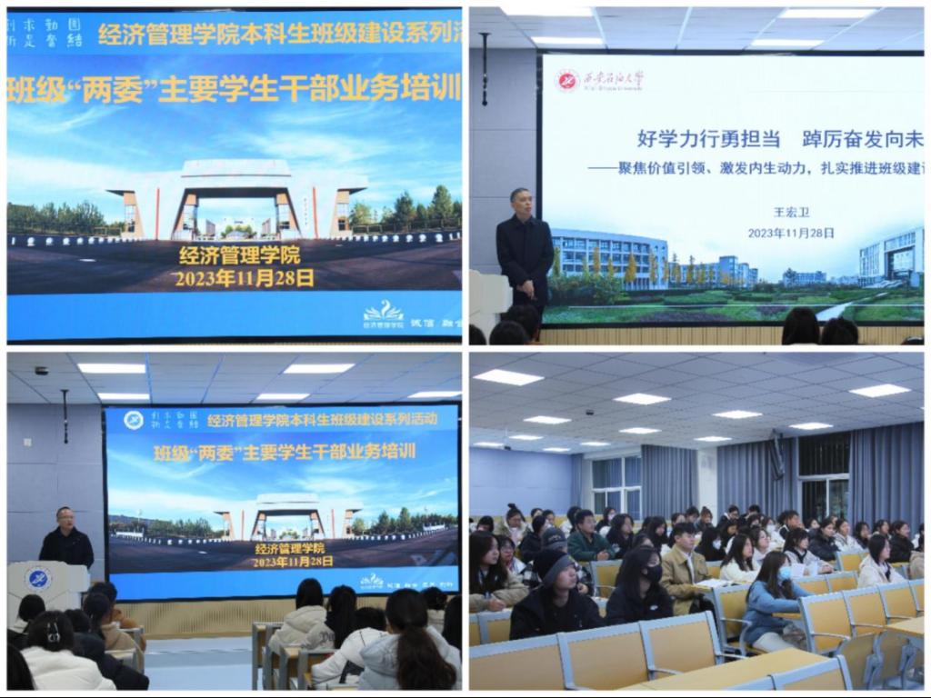 11月28日,經(jīng)濟(jì)管理學(xué)院班級(jí)“兩委”主要學(xué)生干部業(yè)務(wù)培訓(xùn)在鄠邑校區(qū)博覽樓110智慧大講堂開(kāi)展,本次培訓(xùn)由經(jīng)濟(jì)管理學(xué)院黨委書(shū)記王宏衛(wèi)主講,黨委副書(shū)記王剛主持培訓(xùn)會(huì),2021級(jí)、2022級(jí)、2023級(jí)班級(jí)“兩委”主要學(xué)生干部參加。