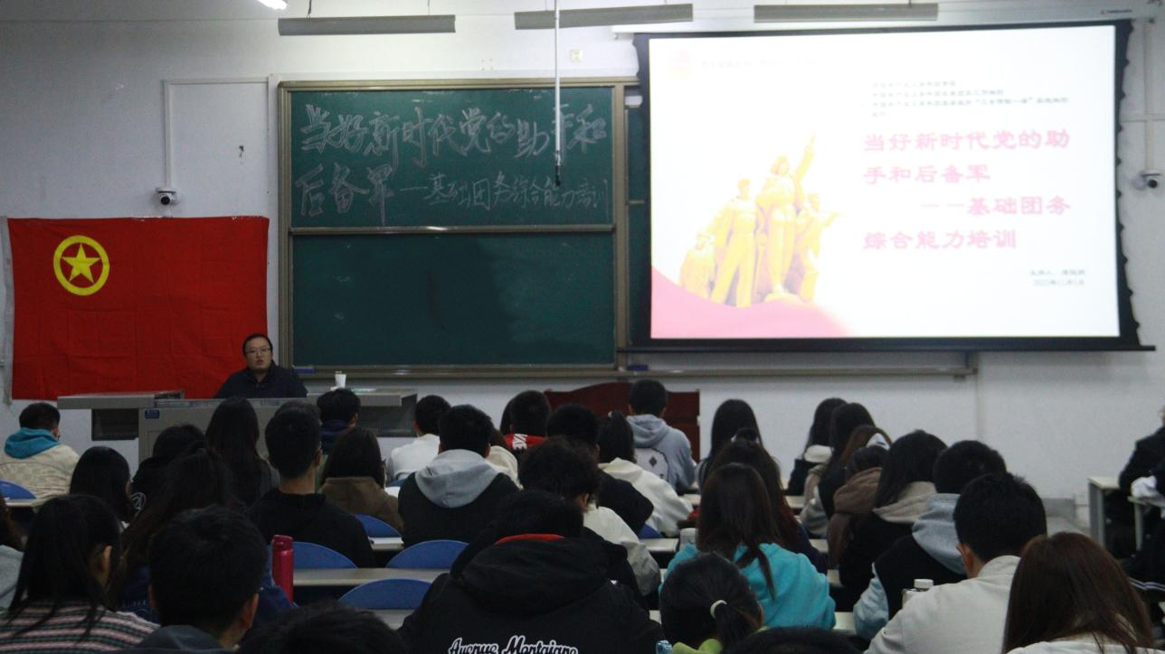 11月5日晚,化學(xué)化工學(xué)院團委書記周鈺銅在鄠邑校區(qū)博思樓101教室,以《當(dāng)好新時代黨的助手和后備軍---基礎(chǔ)團務(wù)綜合能力培訓(xùn)》為題,圍繞團章是什么、為什么學(xué)習(xí)團章兩個角度,對《中國共產(chǎn)主義青年團章程》進行了學(xué)習(xí)解讀,引導(dǎo)同學(xué)們進一步學(xué)習(xí)理解中國共產(chǎn)主義青年團的性質(zhì)、使命和基本任務(wù),特別是結(jié)合《中國共產(chǎn)主義青年團基層組織“三會兩制一課”實施細則(試行)》,對“三會兩制一課”、發(fā)展團員流程、規(guī)范使用團旗、團徽等知識進行了重點講解,希望廣大同學(xué)堅持以習(xí)近平新時代中國特色社會主義思想為指引,深入學(xué)習(xí)習(xí)近平總書記關(guān)于青年工作的重要論述,爭做一名合格的共青團員。