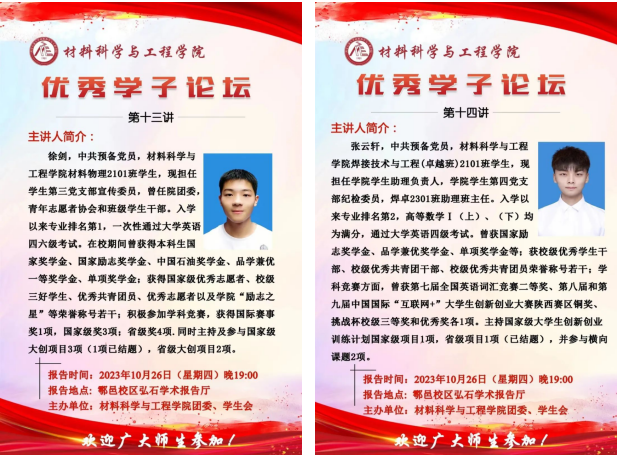 10月26日晚上,材料科學與工程學院在鄠邑校區(qū)圖書館弘石學術(shù)報告廳舉辦優(yōu)秀學子論壇第十三講和第十四講,本期邀請到的優(yōu)秀學子是榮獲國家獎學金、國家勵志獎學金等榮譽的材物2101班徐劍和焊卓2101班張云軒兩位同學,學院2023級全體本科生參加論壇。