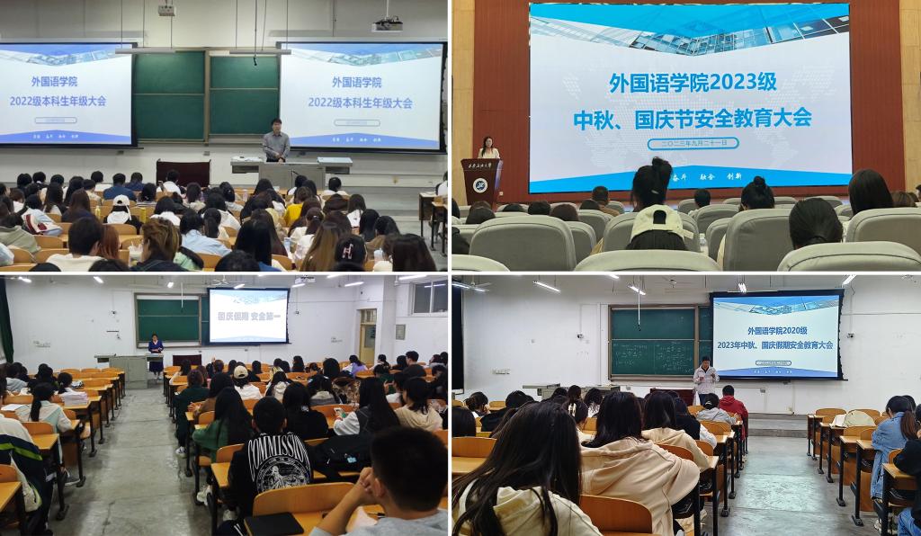 為切實做好學生教育管理服務工作,提高學生安全意識,筑牢安全防線,按照學校安排,外國語學院各年級輔導員分別在鄠邑校區(qū)弘石報告廳、B114、A234、B214召開2023年中秋國慶假期安全教育大會。