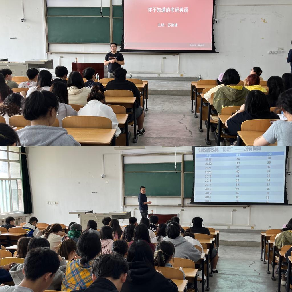 報告會上,蔡乾鋒老師結(jié)合自己的人生經(jīng)歷分析當前社會發(fā)展形勢變化,就考研院校選擇、備考具體事宜、考研注意事項三方面進行了詳細講解,引導(dǎo)同學(xué)們搜集信息、合理報考學(xué)校和專業(yè),依據(jù)自身的學(xué)習(xí)情況確立適當?shù)膱罂寄繕?,幫助同學(xué)們規(guī)避考研常見風(fēng)險,勉勵同學(xué)們認真踏實復(fù)習(xí)、科學(xué)選擇學(xué)校、積極應(yīng)對考試,希望同學(xué)們能夠全力以赴,認真?zhèn)淇?。隨后,蘇楠楠老師從考研英語宏觀形勢、題型構(gòu)成、備考重點和高效復(fù)習(xí)計劃等方面,展開了系統(tǒng)全面的分析和講解,一方面提高了學(xué)生對考研英語的認知,另一方面,為學(xué)生指明了考研英語備考的大方向。